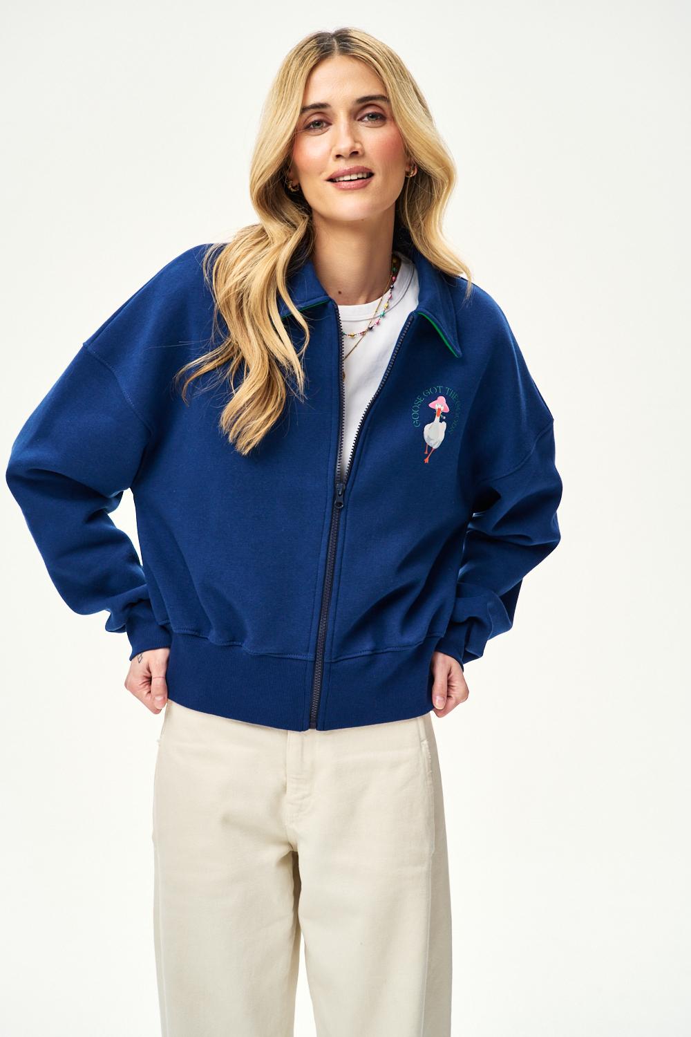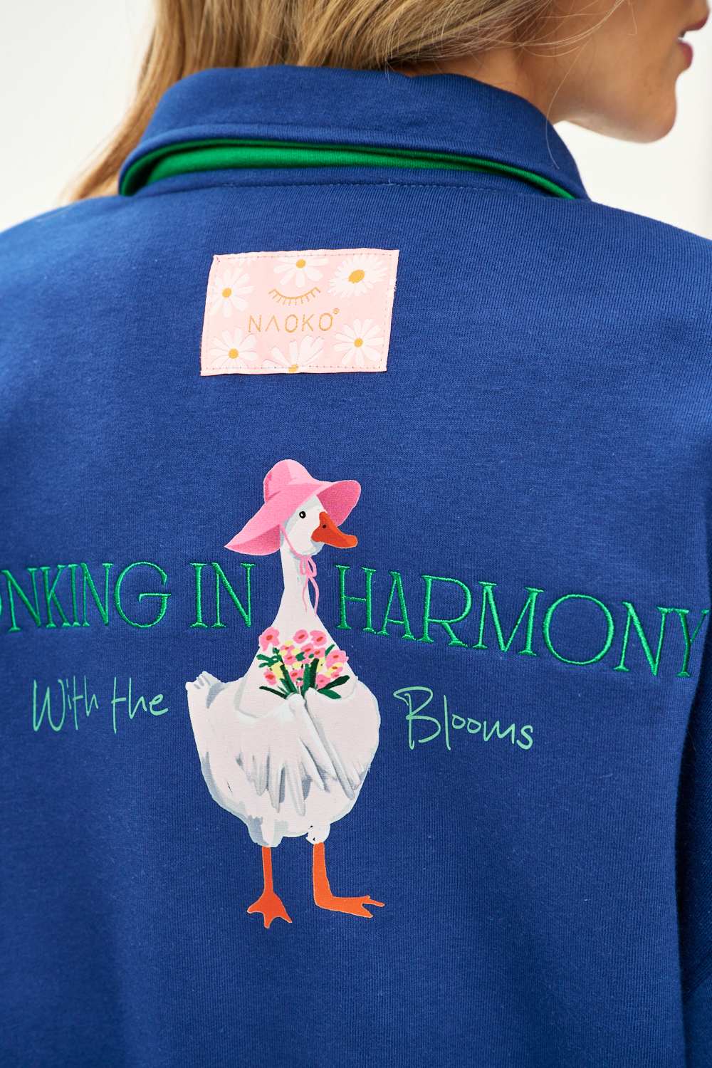 The Mrs. Goose zip-up sweatshirt combines deep navy blue with humor and elegance. The focal point is a goose wearing a stylish hat and the words "Honking in Harmony," which give the whole piece a unique character.