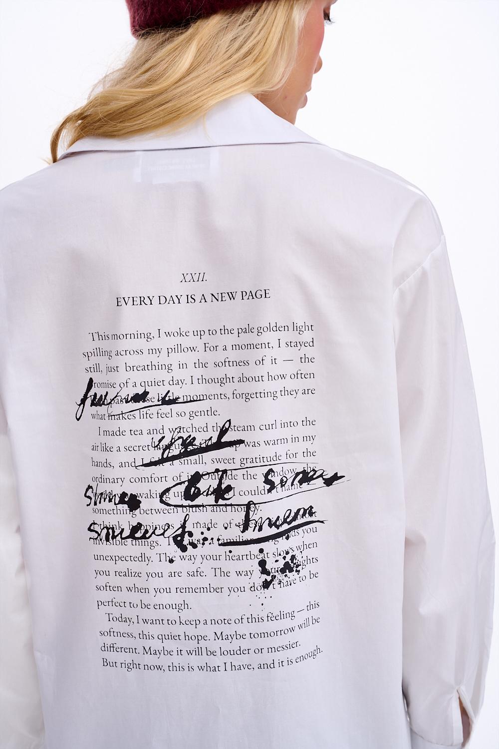 Secret Diary Shirt is een unieke keuze voor liefhebbers van klassiekers met een artistieke twist. Gemaakt van hoogwaardige witte katoenen popeline, maakt het indruk met zijn lichtheid, verfijnde stof en perfecte pasvorm. Het ontwerp heeft een minimalistisch, iets verlengd silhouet en zorgvuldig geselecteerde details – witte knopen aan de voorkant en contrasterende zwarte knopen op de manchetten geven een moderne touch.