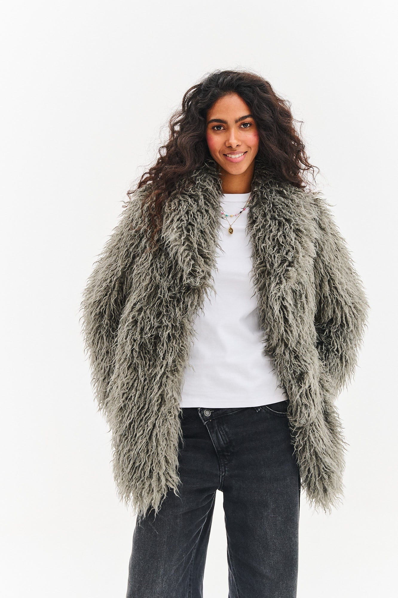 Shadow faux fur jacket is an option for women who are not afraid of striking solutions. Its longer, casual cut and fluffy texture make it an eye-catching garment that provides incredible comfort. The gray color makes it extremely easy to style.