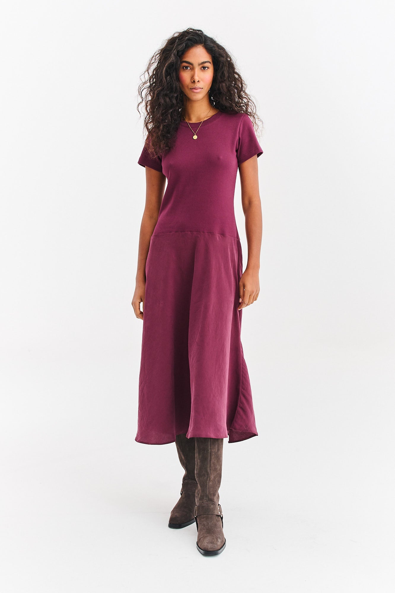 The Meridian midi dress is the sister model of The Signature dress, this time in a beautiful saturated maroon color. The fitted top made of ribbed material perfectly accentuates the silhouette, while the casual, flared midi length hem adds lightness and elegance.