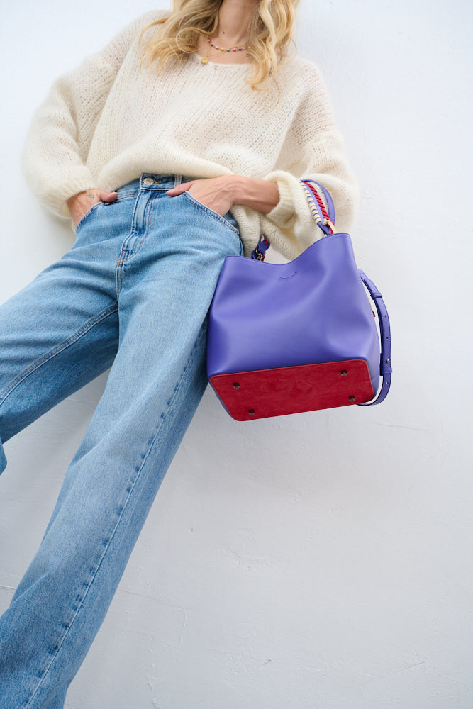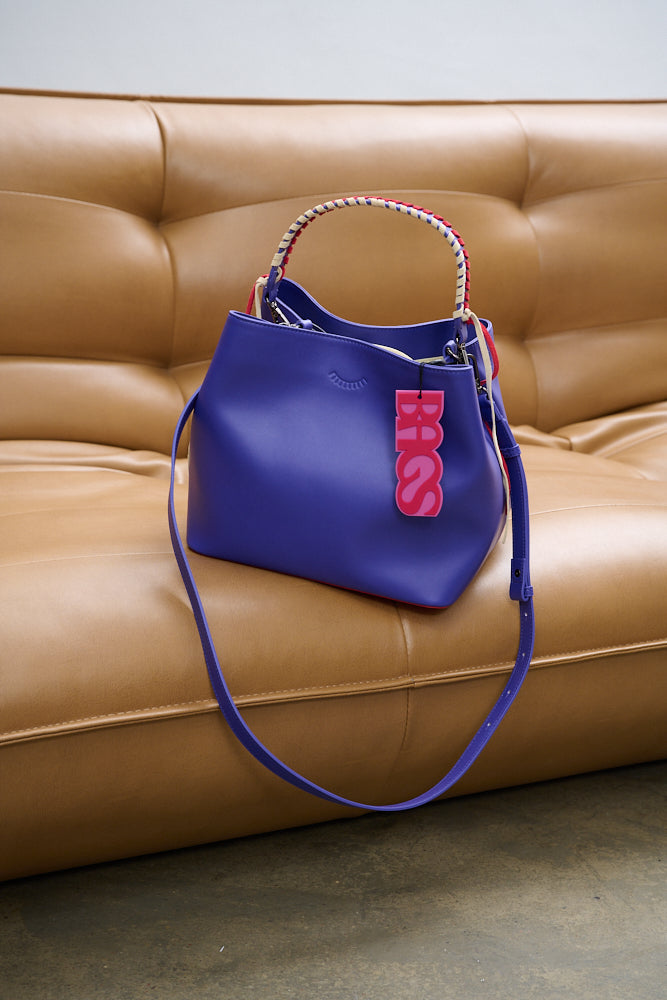 Daydream Mode bag is de perfecte keuze voor vrouwen die van kleur en unieke details houden. Dit bucket-model betovert met zijn hoofdkleur, een verzadigde tint blauw, geaccentueerd met contrasterend rood aan de onderkant.