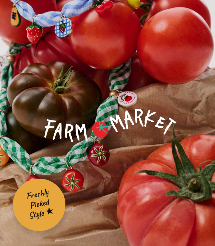 Farm Market turns your ordinary morning coffee run into a fashion statement. Soft muslin, stripes like a market awning, vegetable embroideries, cotton T-shirts and jewellery that tastes like summer. A wardrobe for real life — picnic, brunch, a city stroll for bread.