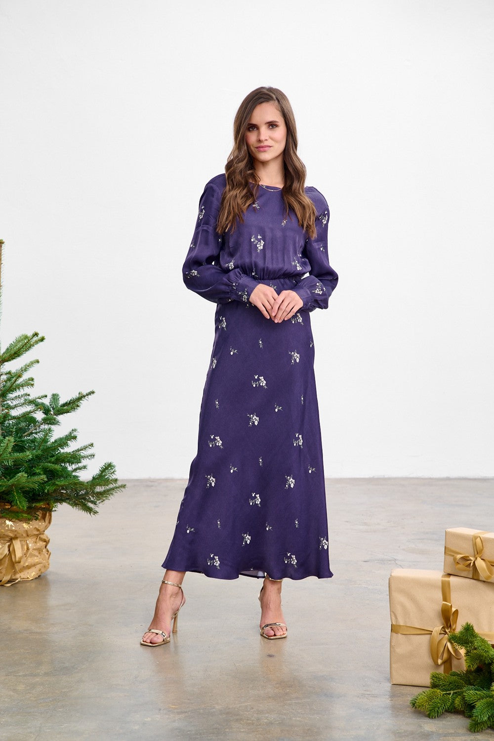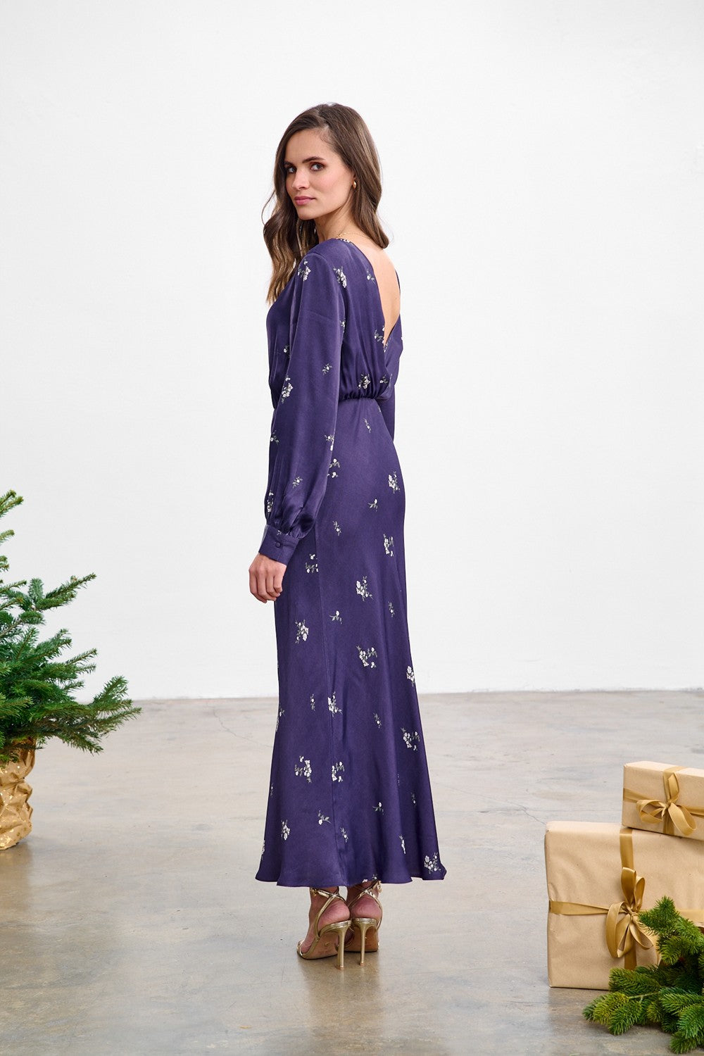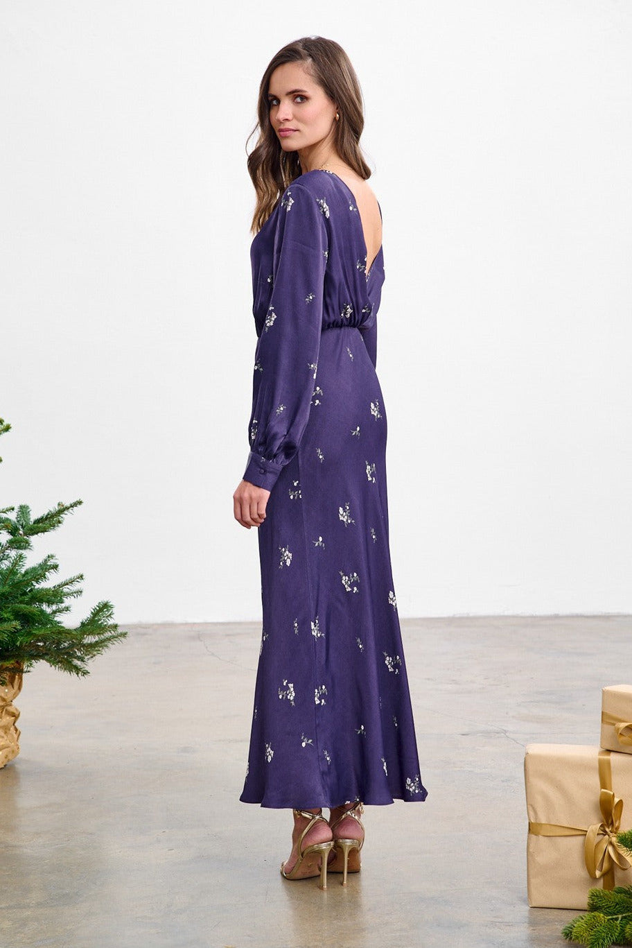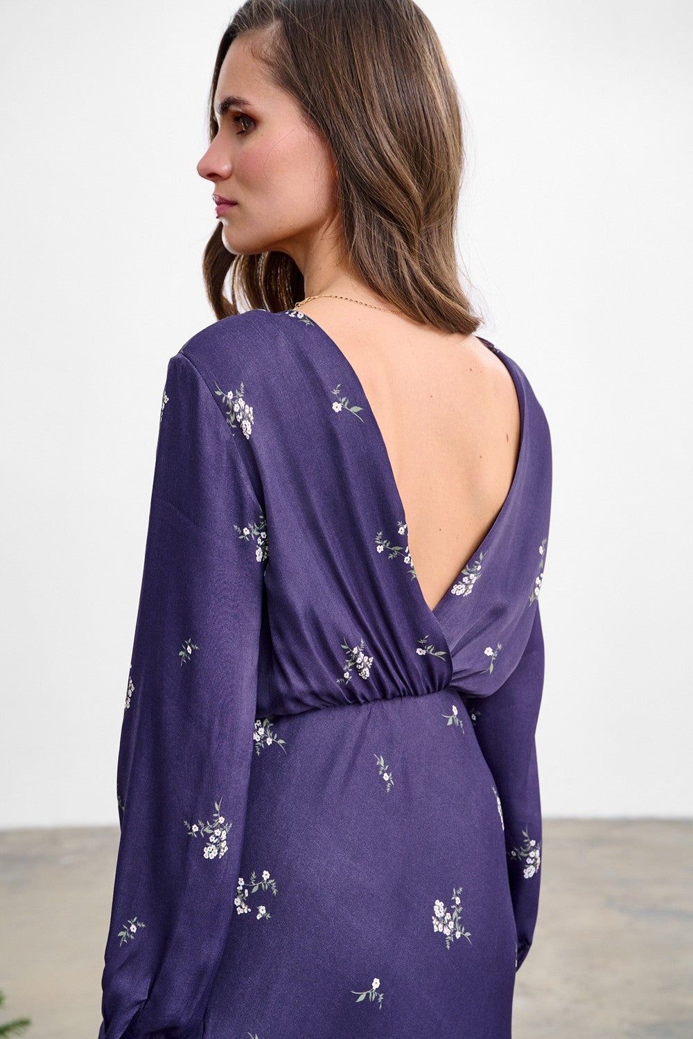After Dark long dress is a statement piece. The dark fabric provides a backdrop for subtle, light flowers, creating a romantic contrast. The waistband ties perfectly accentuate the waist, and the wrapover neckline adds a touch of elegance. Long sleeves with cuffs make the dress perfect for cooler days.
