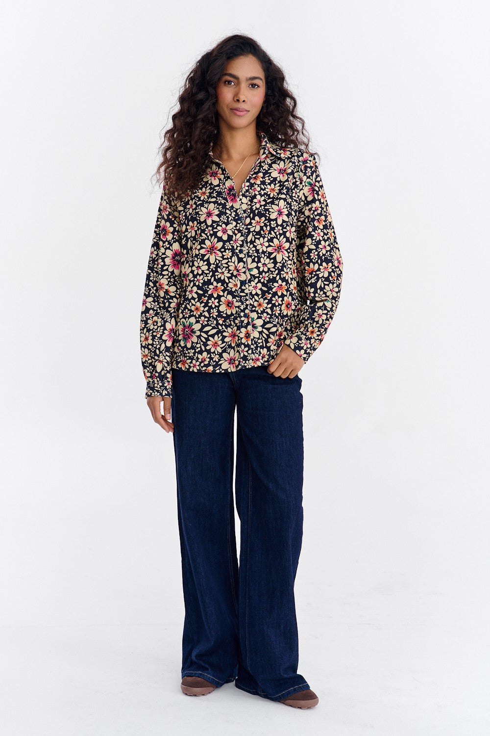 The After the Rain Corduroy Shirt is the perfect choice for cooler days. Made of soft, printed corduroy, it will wrap you in warmth and add a unique charm to your outfit. The floral pattern in shades of pink and beige contrasts beautifully against the dark background.