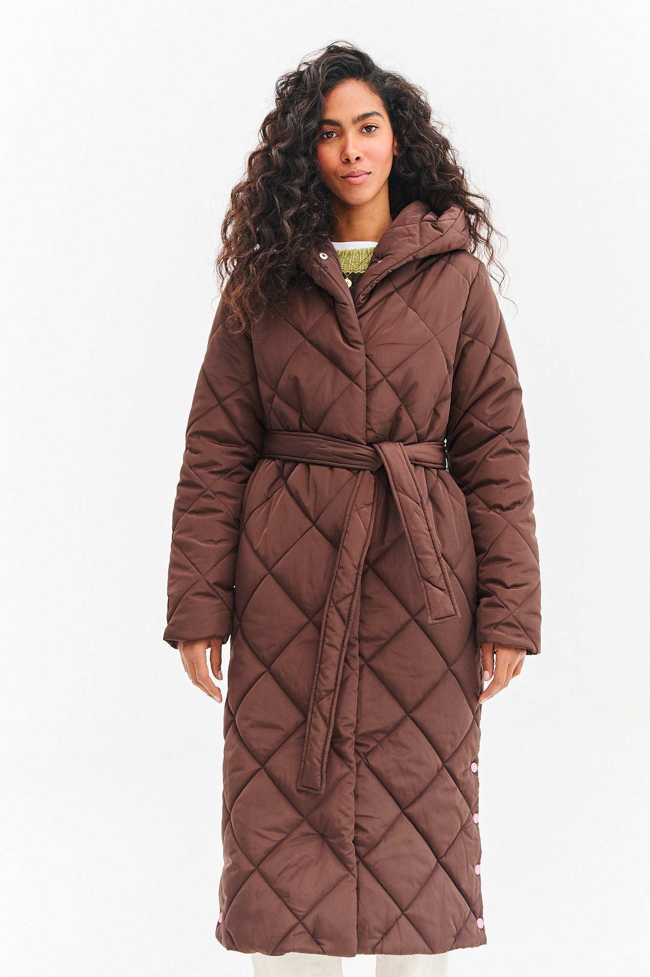 Anabelle Raven quilted coat combines a regal design with everyday functionality. The long cut and warm, quilted filling ensure comfort on cold days. The large hood envelops and protects, while the belt allows for a perfect fit to your figure. Inside, there is a lining with a contrasting pattern.
