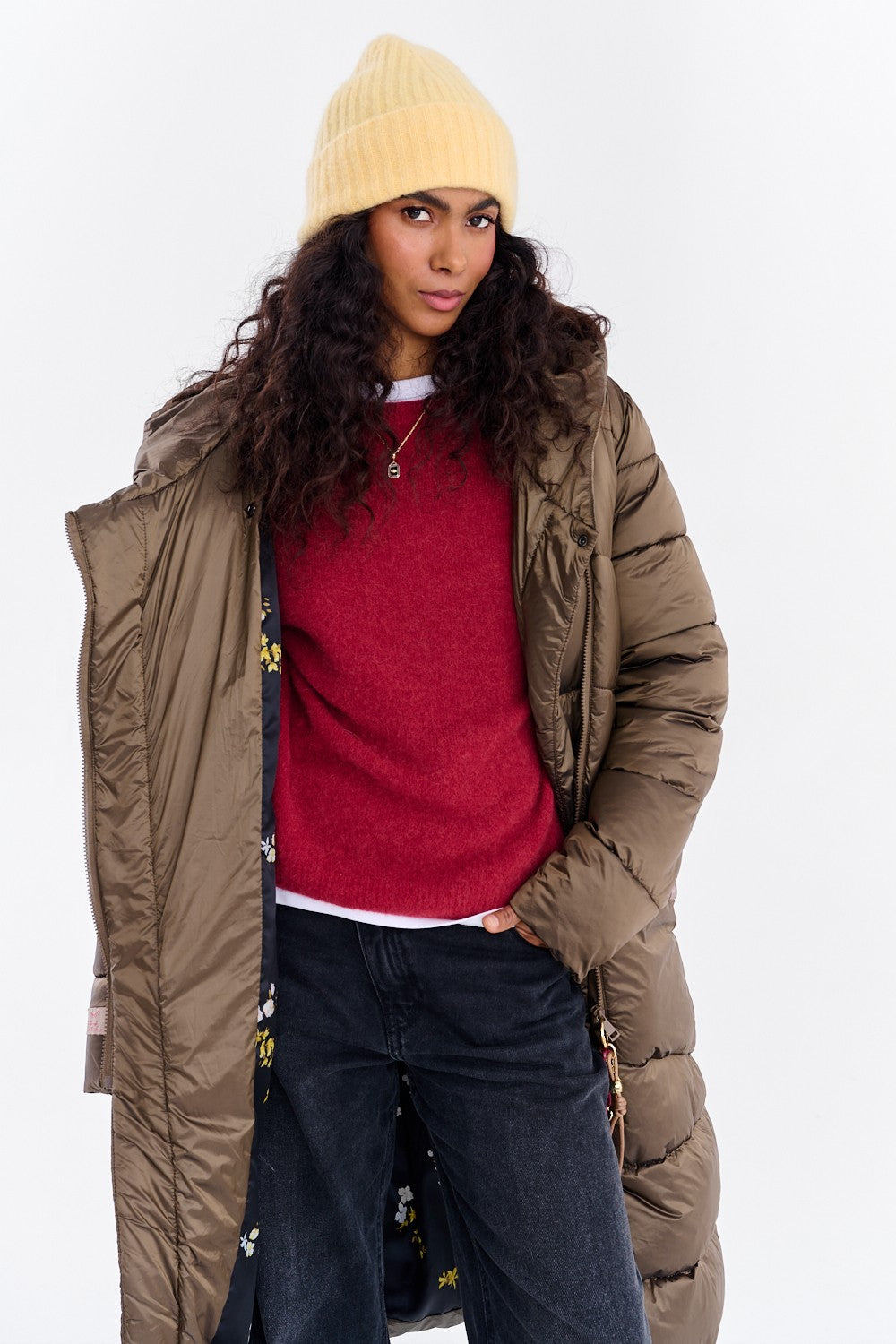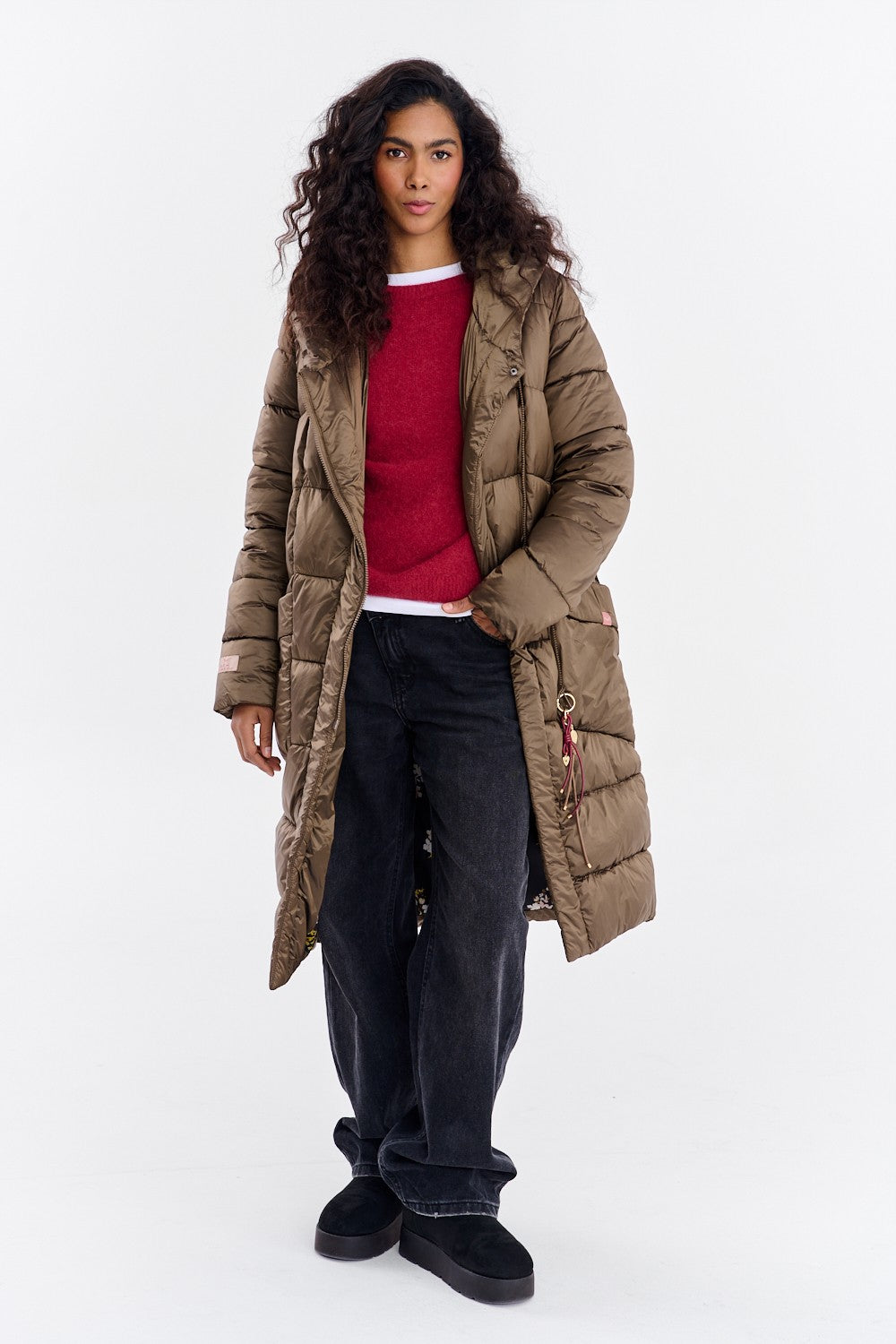 Arcticum Cocoa quilted coat is the essence of winter elegance. The long design with a spacious hood and asymmetrical fastening effectively protects against cold and wind. The slightly shimmering material gives it a chic character, making the coat perfect for many situations.
