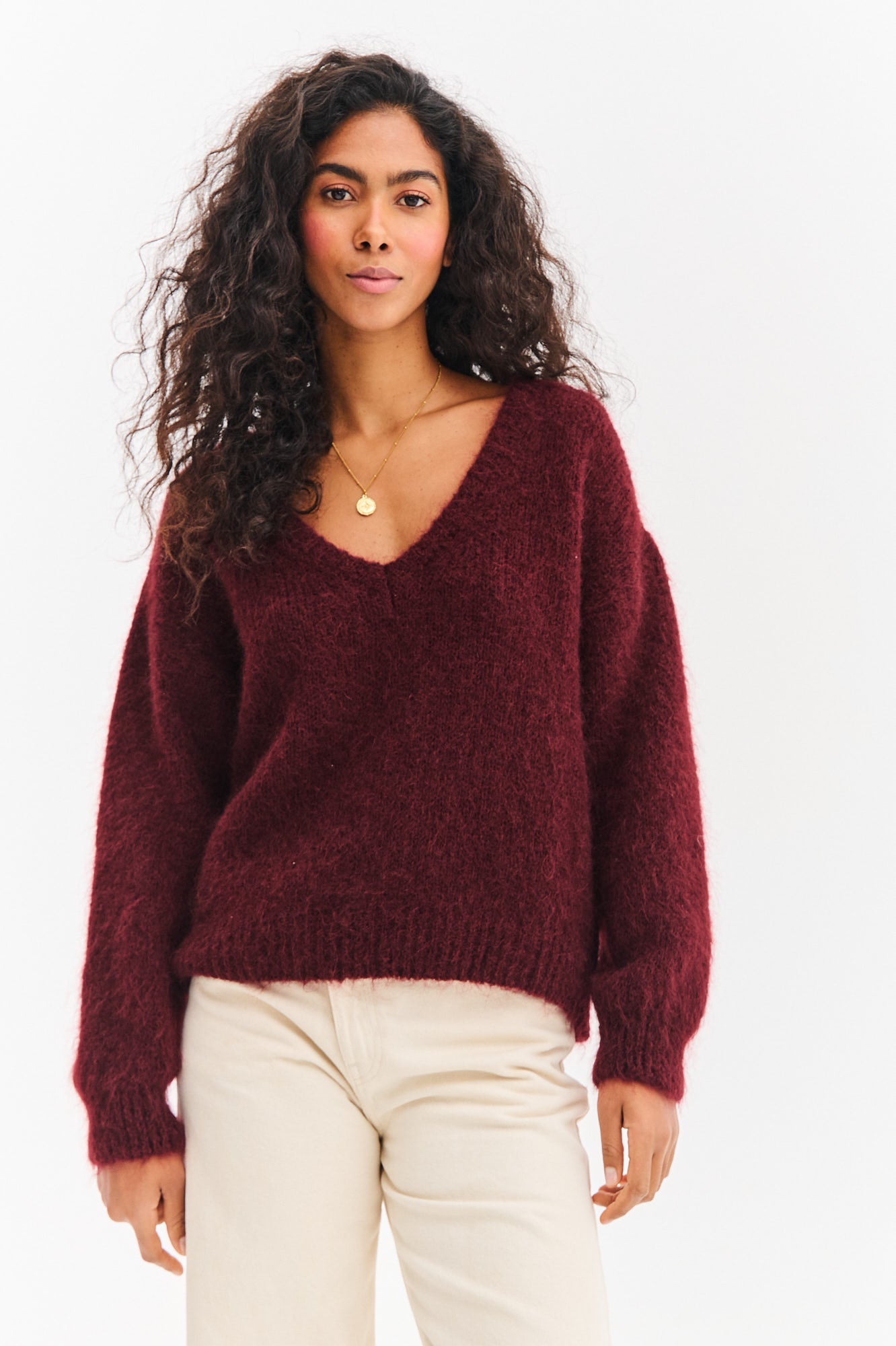 Berrylicious wool sweater is the quintessential autumn comfort and elegance. Made from a high-quality blend with mohair, it is extremely soft and pleasant against the skin. The deep burgundy color inspired by ripe forest fruits will add class to any outfit.