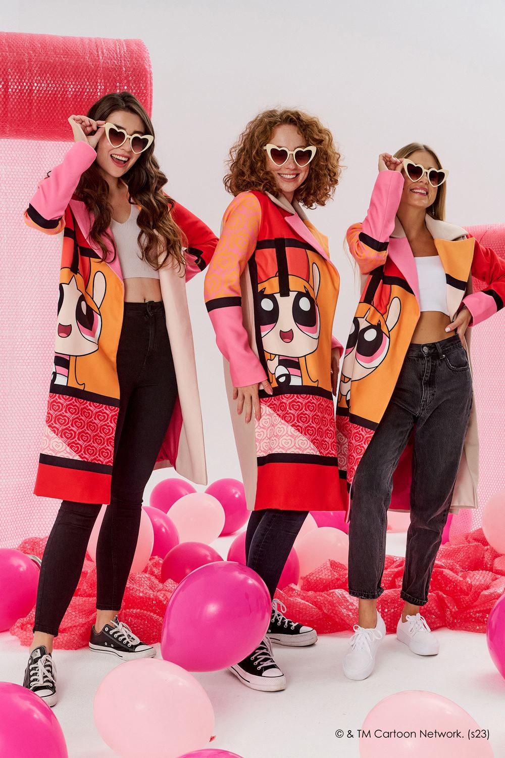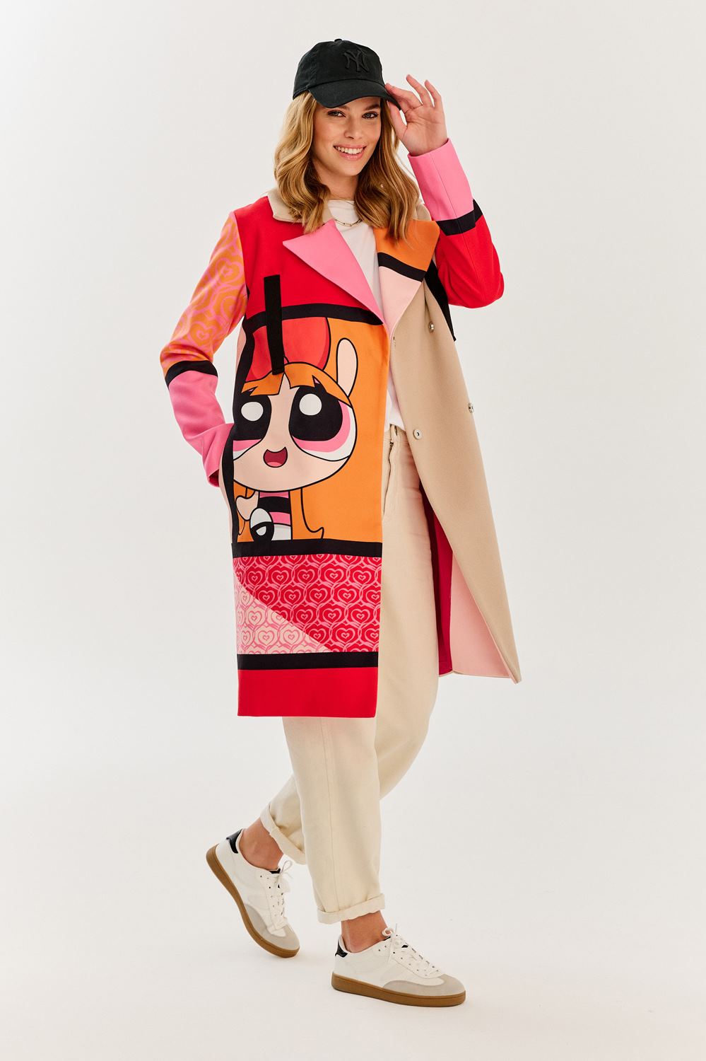 The simple, classic cut coat features a neutral beige back and a colourful front with an image of the Powerpuff Girls, so your superpower will be to stand out in a crowd and put a smile on the faces of those around you (and your own too, by the way). The combination of pink, orange and red is both cohesive and contrasting, creating a multicoloured, striking look.