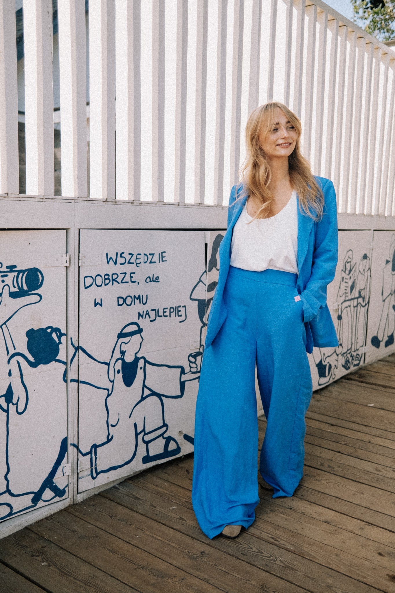 Blue Margarita linen jacket is a breath of tropical freshness and a color that does not go unnoticed. Intense shade of blue inspired by a cocktail by the shore of the pool, attracts the eyes and gives energy to any styling.