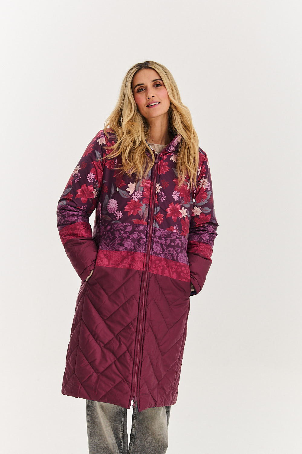 No matter which side you choose, this long coat will keep you warm and comfortable. The generous hood (also double-sided!) will protect you from bad weather, and the full-length zipper will make it easy to use. Play with fashion and change your look in a second.