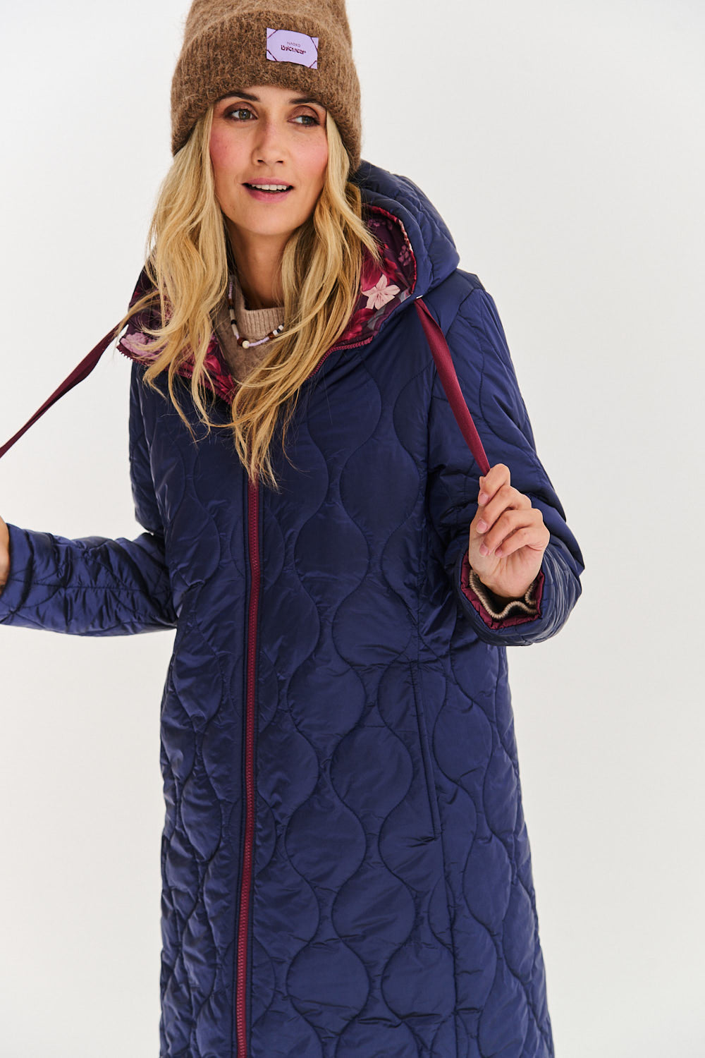 The Blush In The Dark double-sided coat is an absolute must-have for the indecisive and those who appreciate versatility. One side is an artistic combination of the "Moss Garden" pattern on top and smooth maroon on the bottom. The other side is a solid navy blue with elegant wave-shaped quilting.