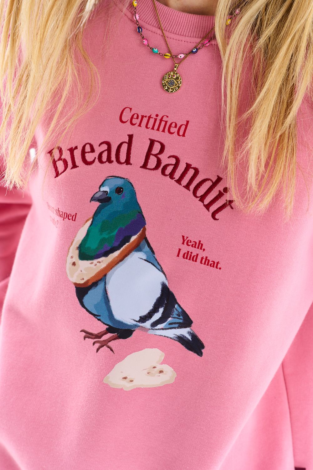 The Bread Bandit sweatshirt is a tribute to the city's most famous residents. A pink base and a unique graphic featuring a dove and the inscription “Bread Bandit” is a recipe for a smile-inducing look.