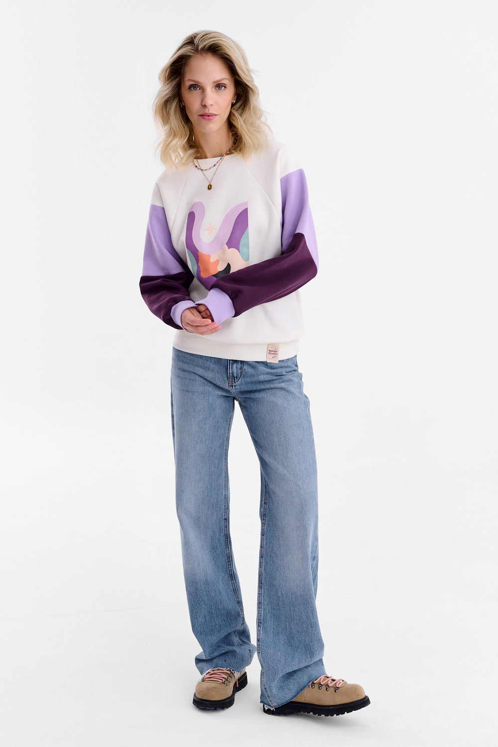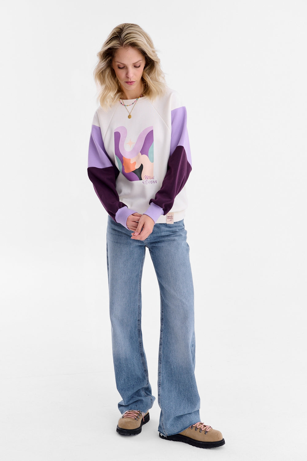 The Face The World sweatshirt is a manifestation of feminine strength and peace, transferred onto fabric by Maggie Stephenson. As part of the Naoko x Artist Remix project, the American illustrator has created a work that is a visual story about the courage to be yourself. The oversized cotton sweatshirt combines a cream body with sleeves in shades of lilac and deep purple.