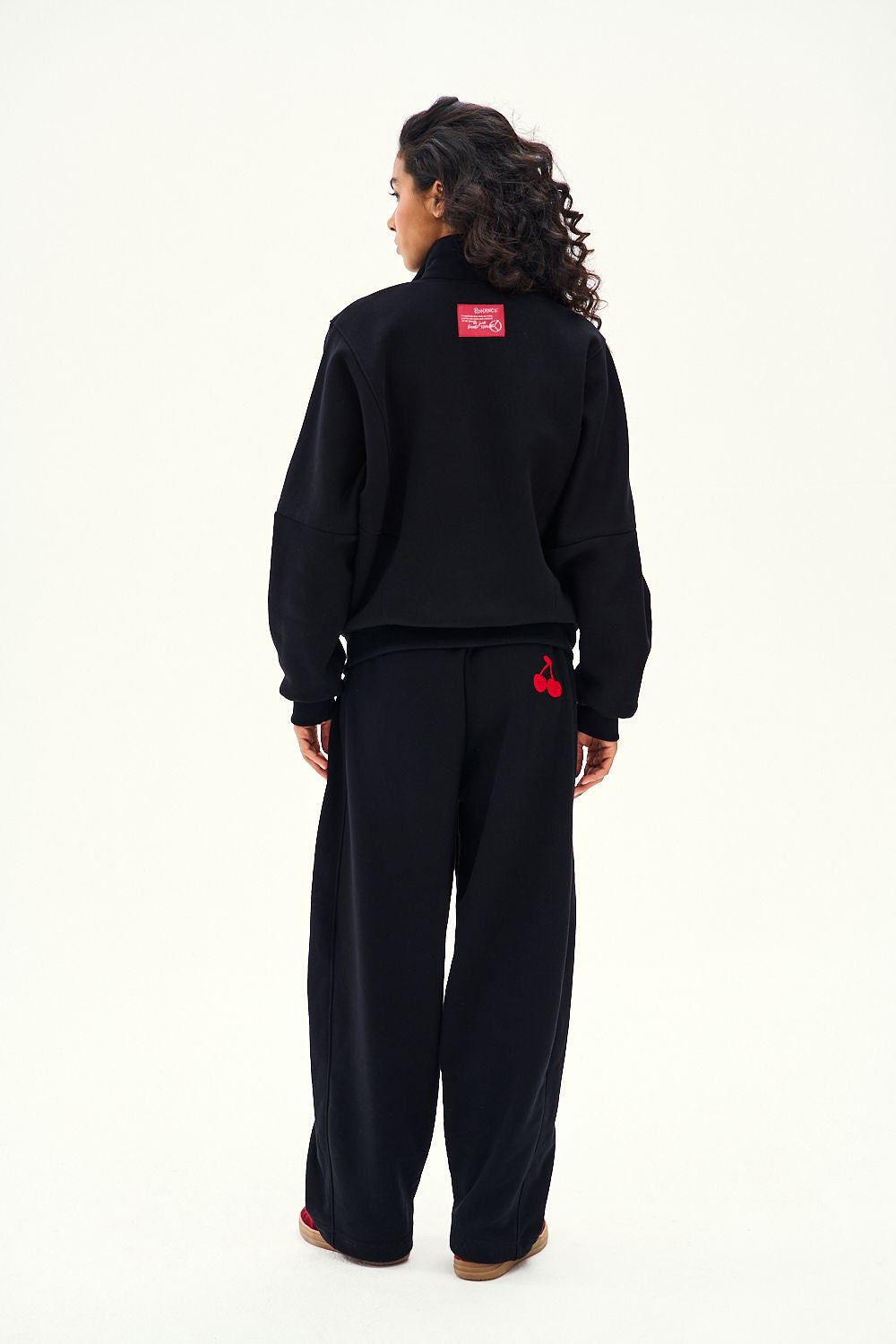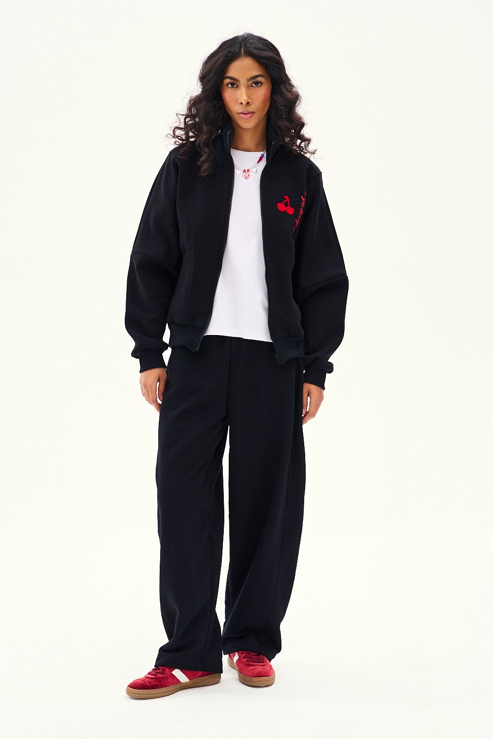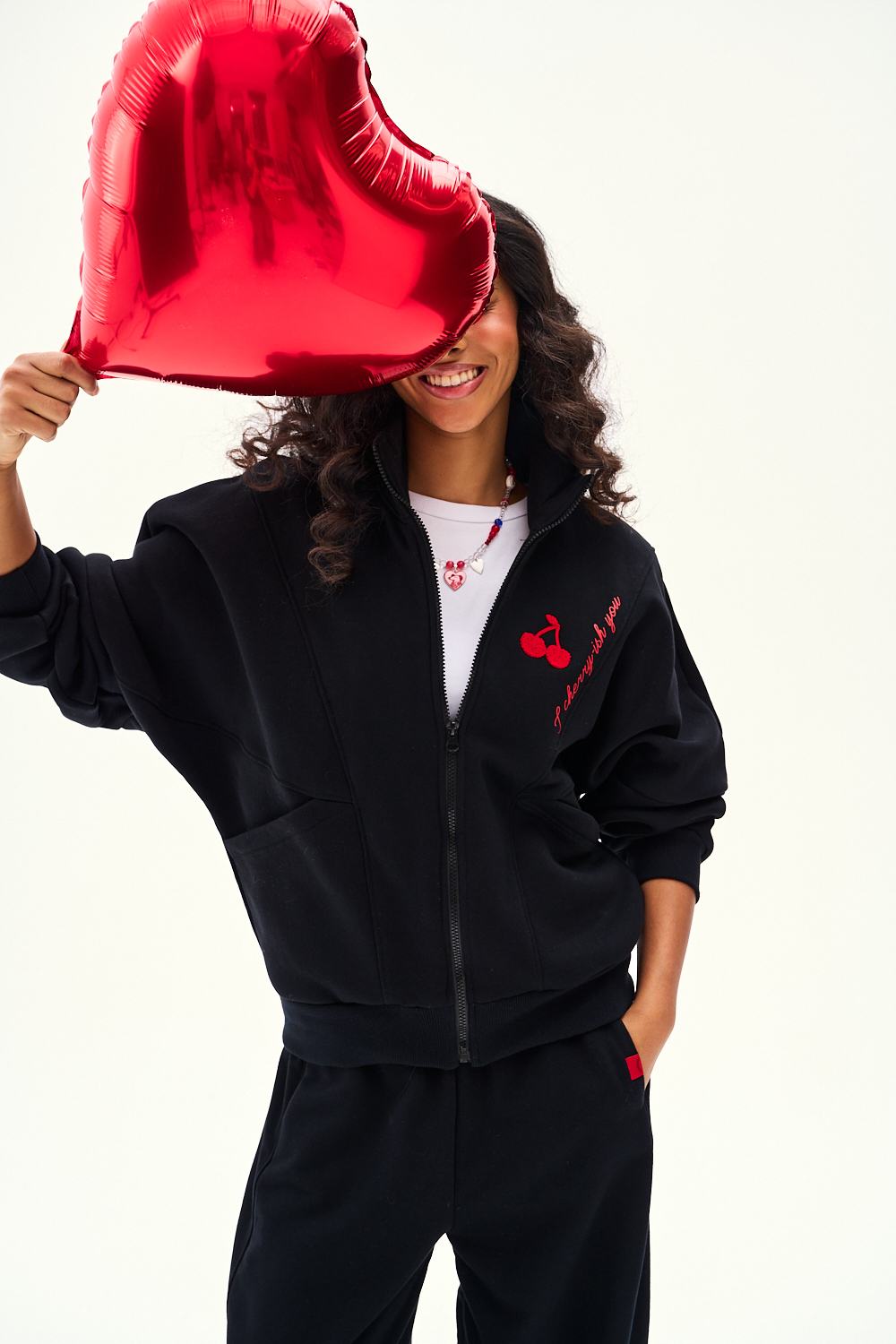 The Cherry-ish Moments zip-up sweatshirt is a versatile piece for your wardrobe. Deep black, a stand-up collar, and embroidered cherries create a look that's perfect for both your workout and a night out.