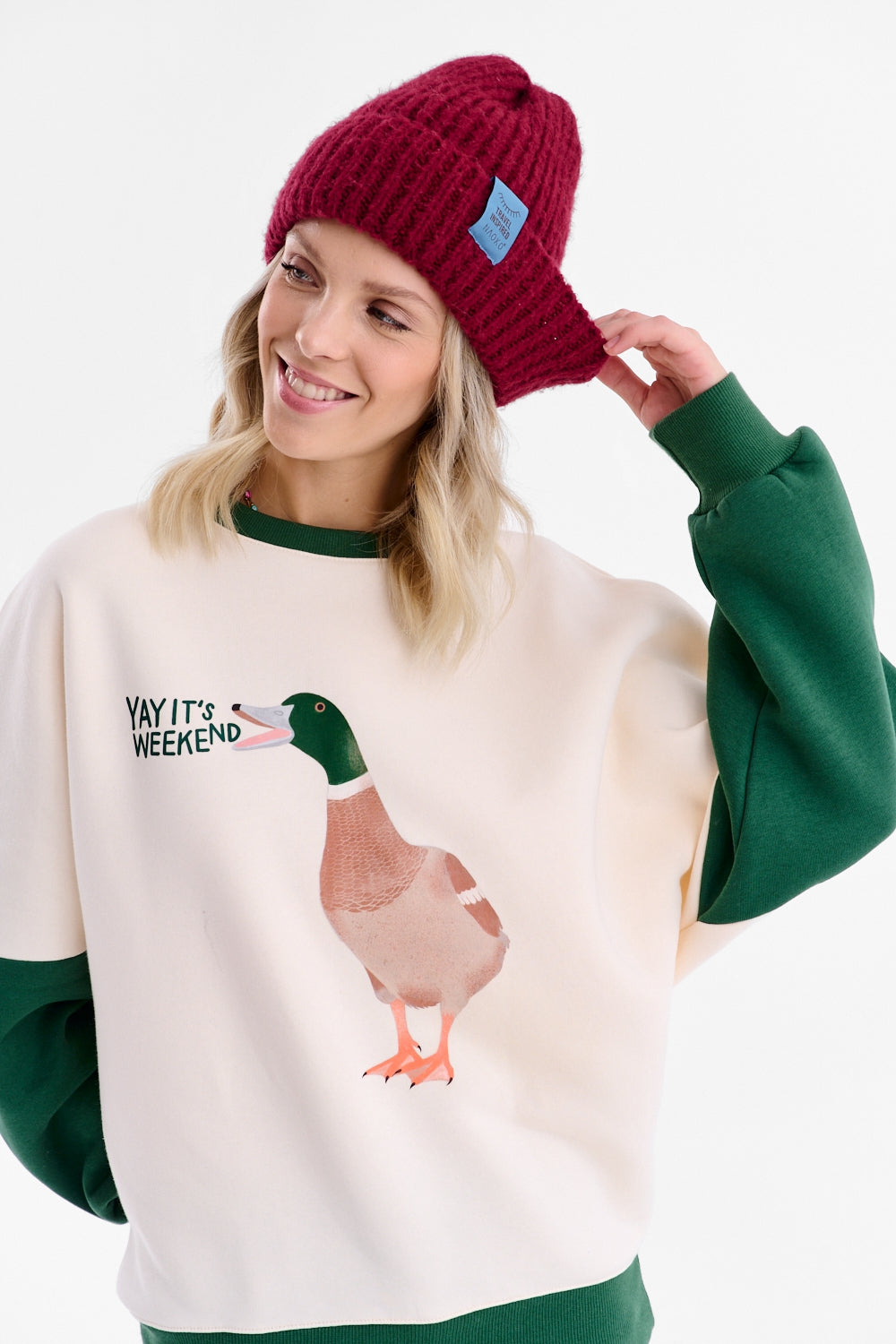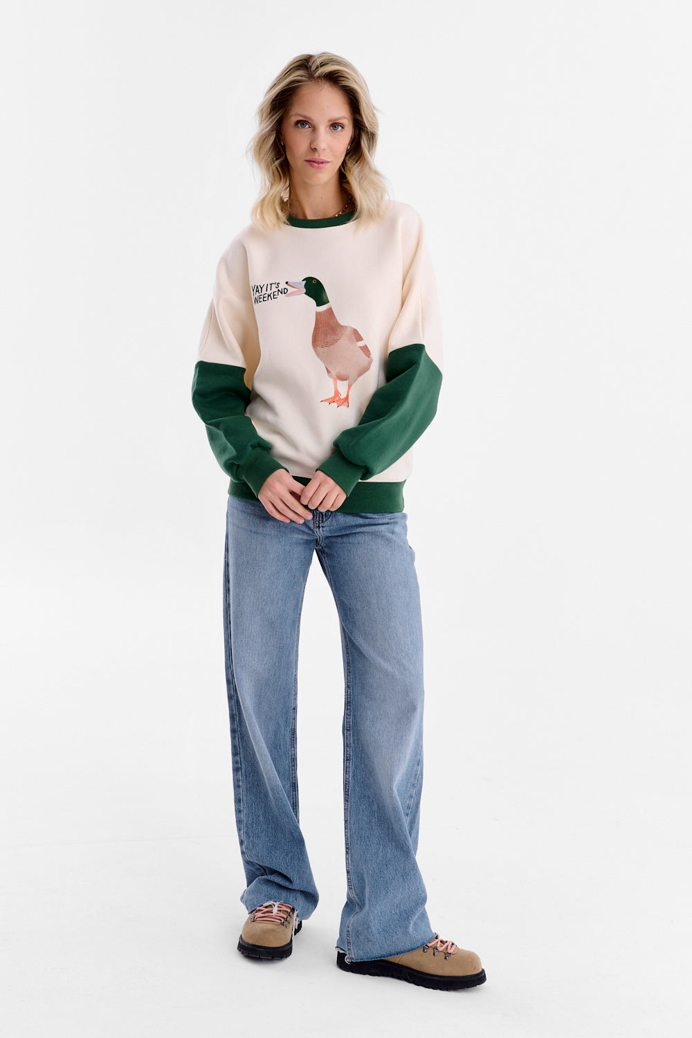 The Wild Quack sweatshirt is a humorous touch in the Naoko x Artist Remix collection, bringing a Scandinavian lightness to your wardrobe. Swedish illustrator Cecilia Petterson shows her love of nature with a wink. The cream body of the sweatshirt, paired with bottle green sleeves, creates a harmonious, natural whole.