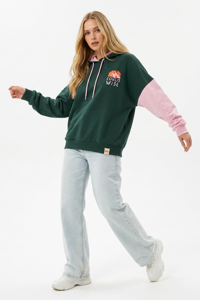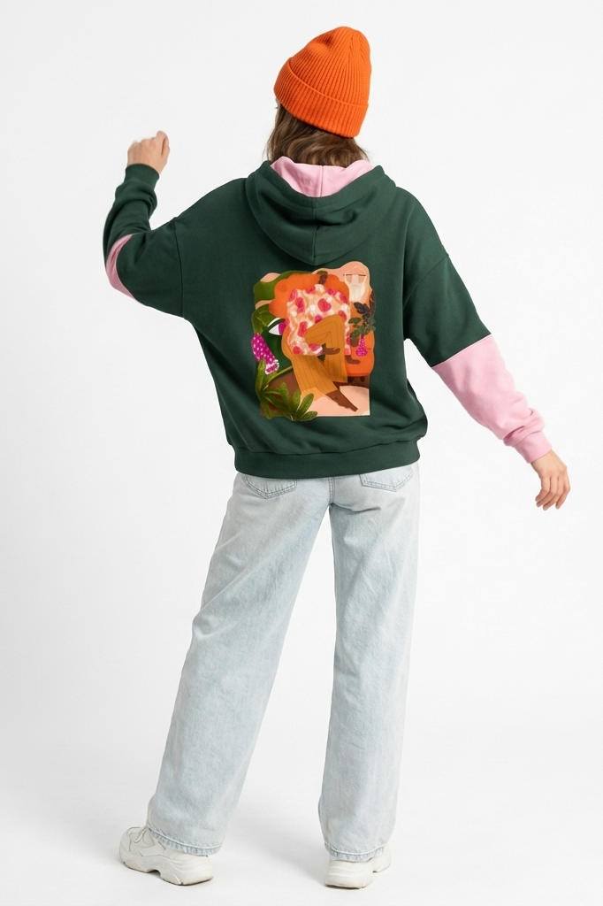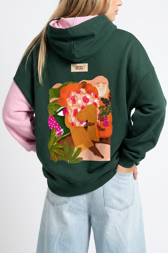 The Wise Love Hoodie is a garment that hugs. Created in collaboration with Loveis Wise as part of the Naoko x Artist Remix project, it combines deep bottle green with a delicate, powder pink on one sleeve. This asymmetrical combination symbolizes the harmony between strength and sensitivity so characteristic of the artist's work.