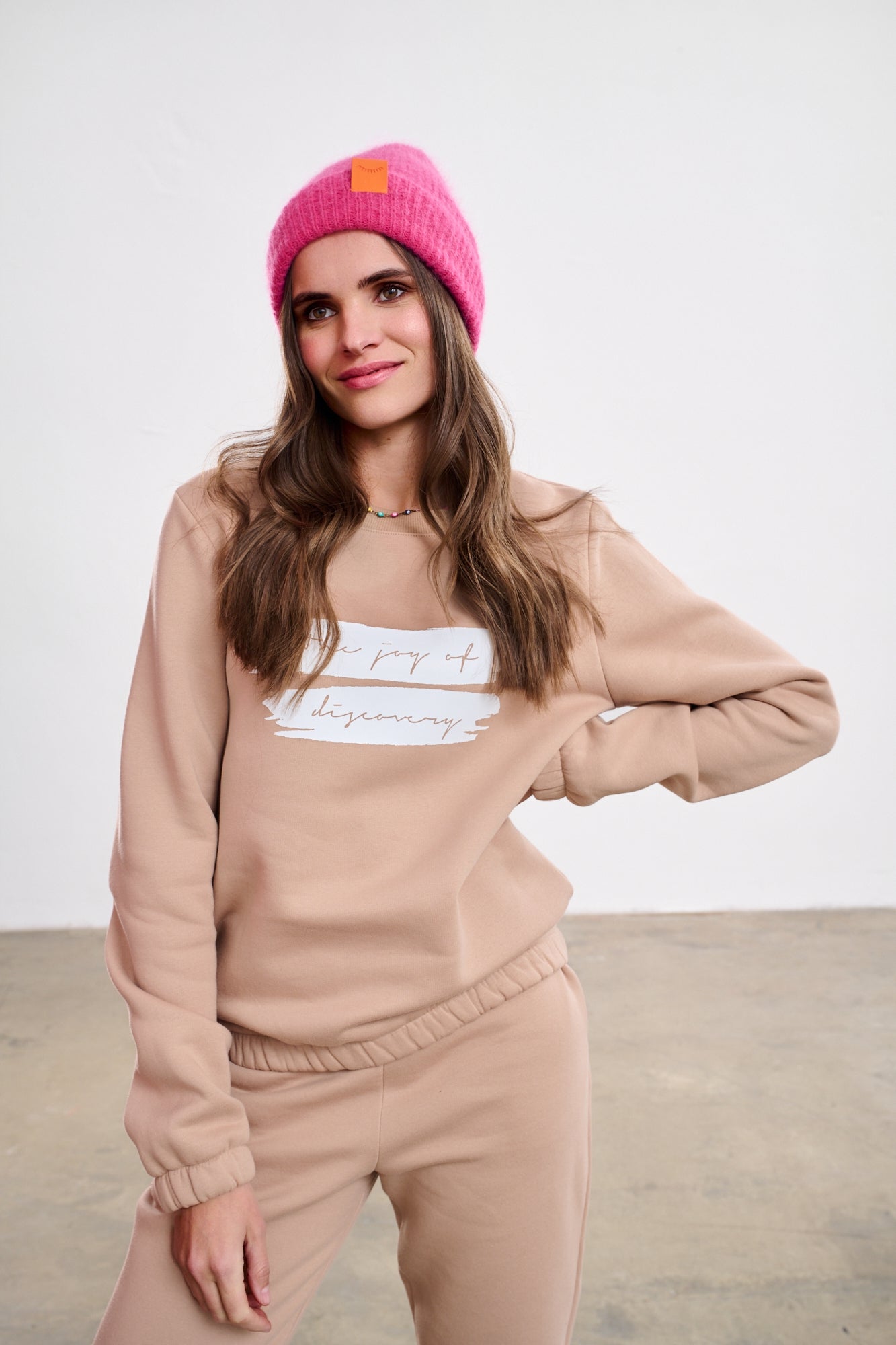 The Joy Of Discovery print sweatshirt is the perfect top to pair with your favourite The Wanderer sweatpants. In the same warm shade of coffee with milk, it creates a cohesive and stylish ‘monolook’ set that will work in any situation.