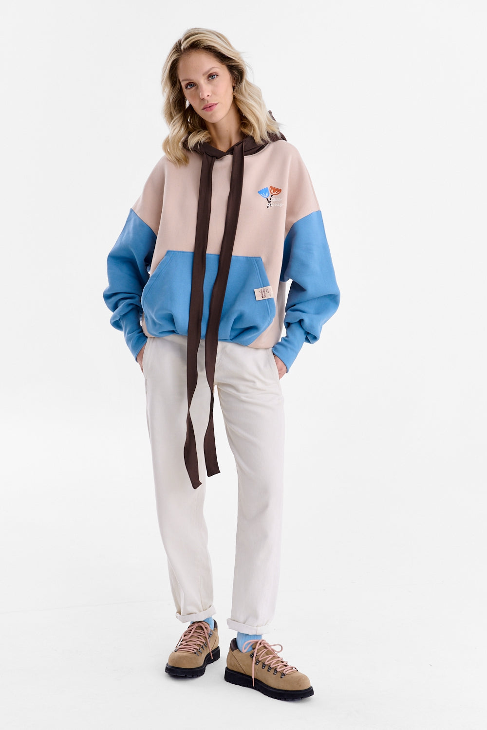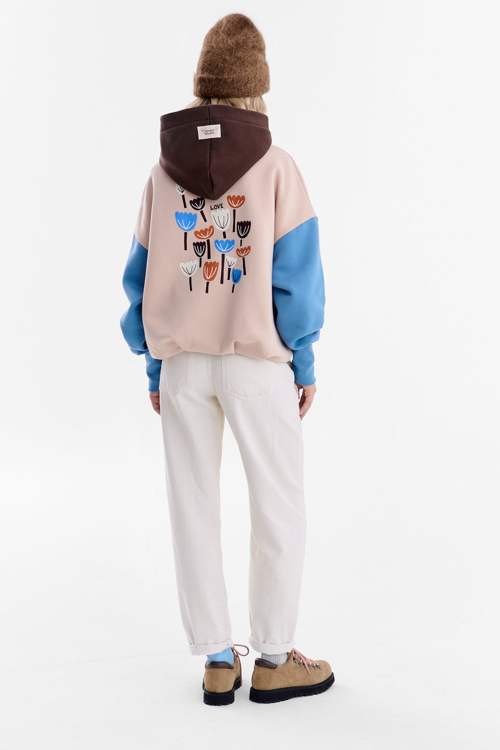 The Blooming Back Tie Sweatshirt is a manifestation of artistic sensibility, created by French illustrator Claire Iglesias as part of the Naoko x Artist Remix project. The oversized cut combines pastel beige, saturated blue, and deep brown, creating a backdrop for energy-pulsating, surreal tulips.