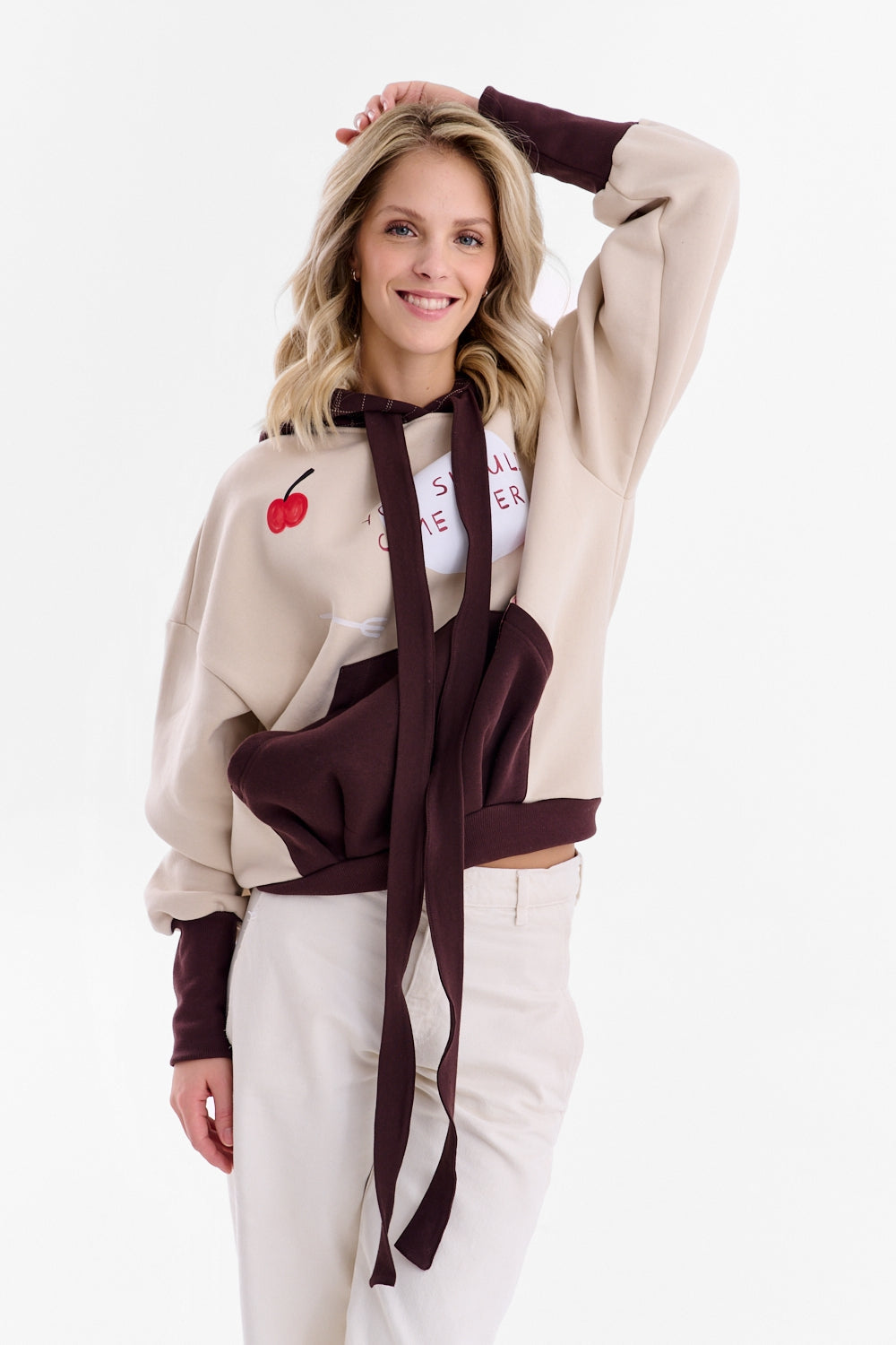 Not only the charming graphic with cherries and the inscription "You should come over" catches the eye, but also the distinctive, wide tie at the hood. It's an artistic response to the question of what we want to cultivate: relationships, hospitality, and the warmth of home. By purchasing this sweatshirt, you support the Kosmos dla Dziewczynek Foundation.