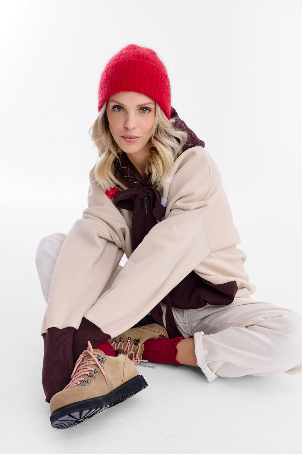 The Come Over Tie Sweatshirt is the quintessence of Kit Agar's style – warm, minimalist, and full of emotion. As part of the Naoko x Artist Remix project, the British artist has created a design that's like an invitation to intimacy. The oversized cut combines creamy beige with deep brown pockets, cuffs, and hood.