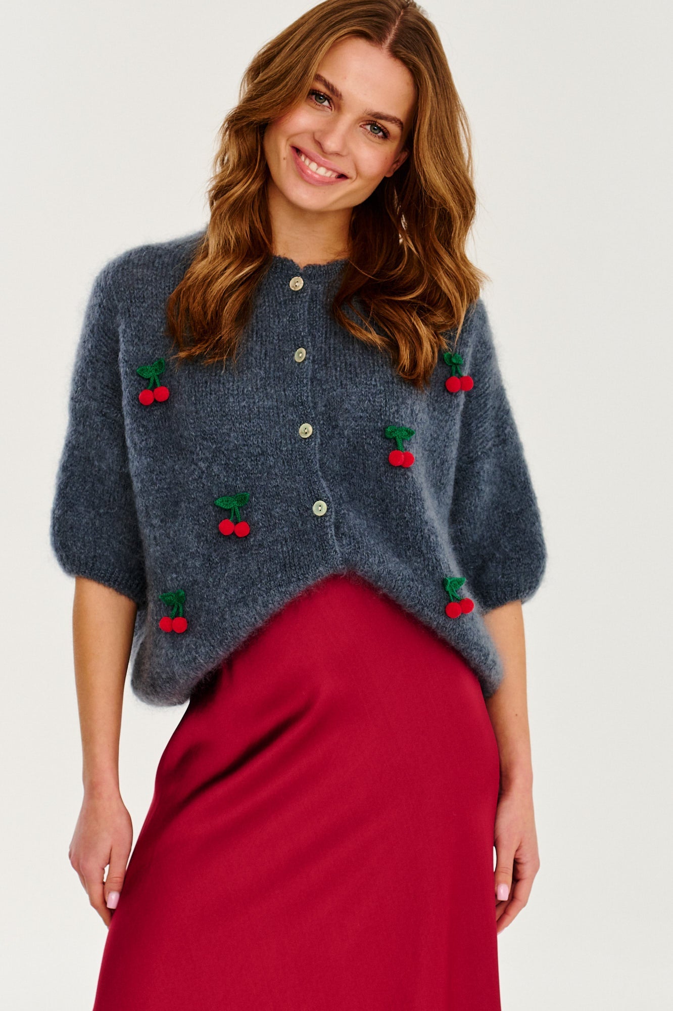 Wrap yourself in a soft Cherry on Top mohair cardigan that draws the eye with its subtle cherry motif embroidery. This unique sweater in a shade of dark gray adds charm and softness to any outfit, while providing warmth and comfort.