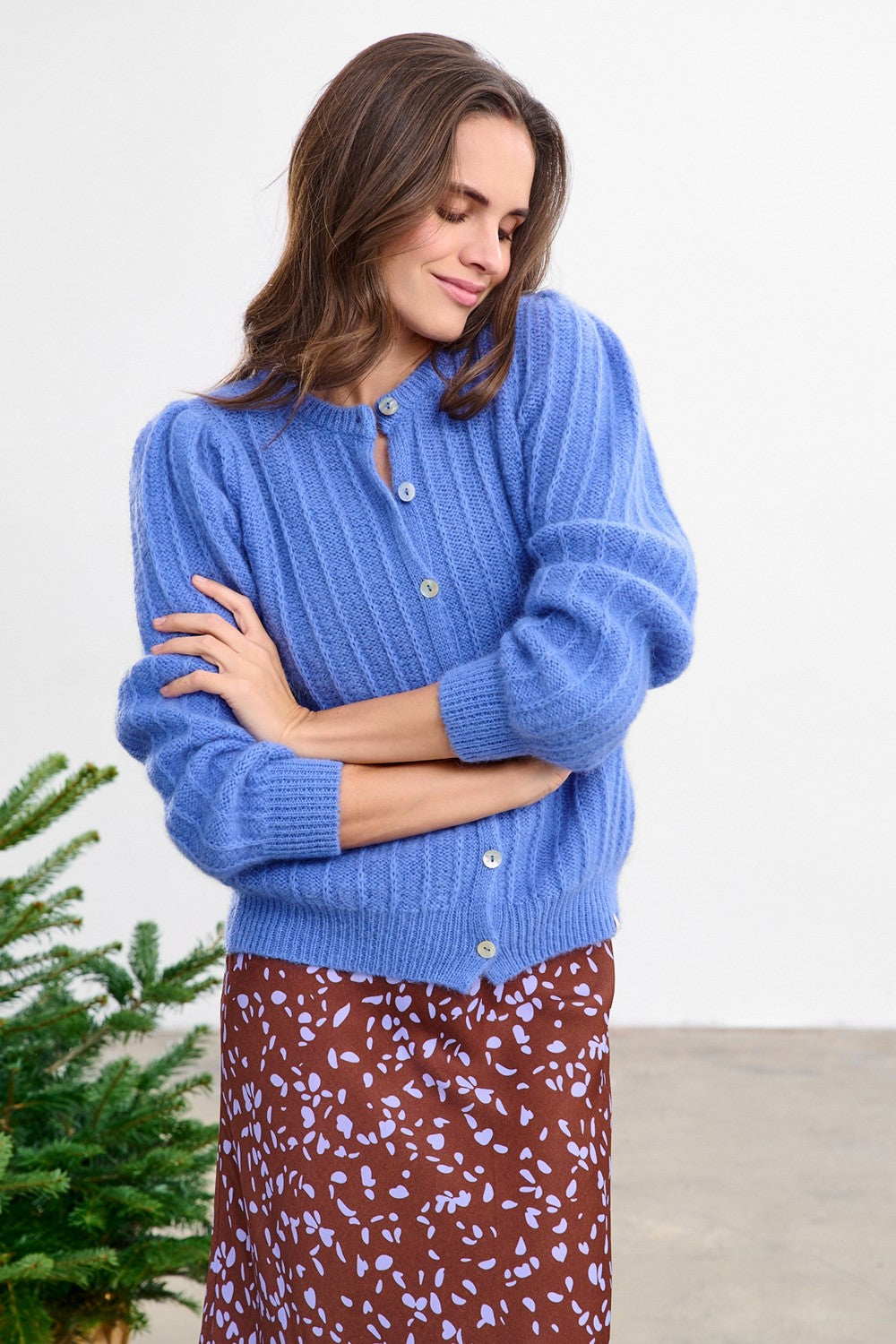 Cloud Nine Wool Cardigan is a sweater you won't want to part with. Made from a soft yarn with a touch of wool, it keeps you warm on cold days. The vertical weave slims your figure, and the puffed sleeves with ribbed cuffs are a detail that sets it apart from classic cardigans.