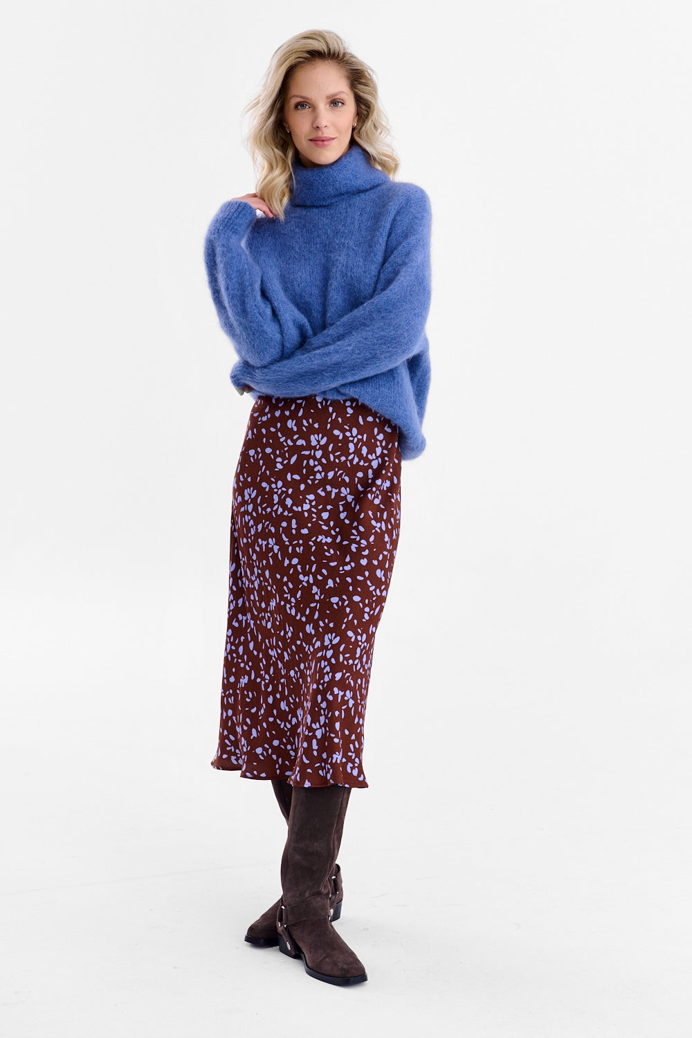 The sweater has a loose, relaxed fit with dropped shoulders, guaranteeing comfort and a casual look. The soft, loose turtleneck comfortably hugs the neck without constricting it. It's the perfect choice for jeans, cigarette pants, or a satin skirt, adding a cozy touch.