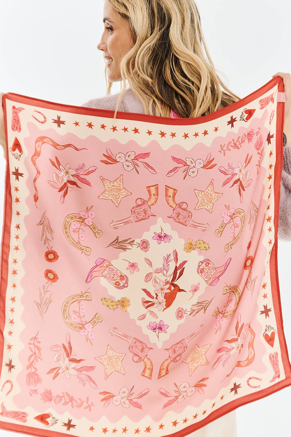 The Cowgirl Candy scarf is a joyful interpretation of the Wild West. The pastel background, adorned with graphics of cowboy boots, floral revolvers, and horseshoes, creates a unique, "candy" mix. It's an accessory that will brighten up any face and add a girly charm with an edge.