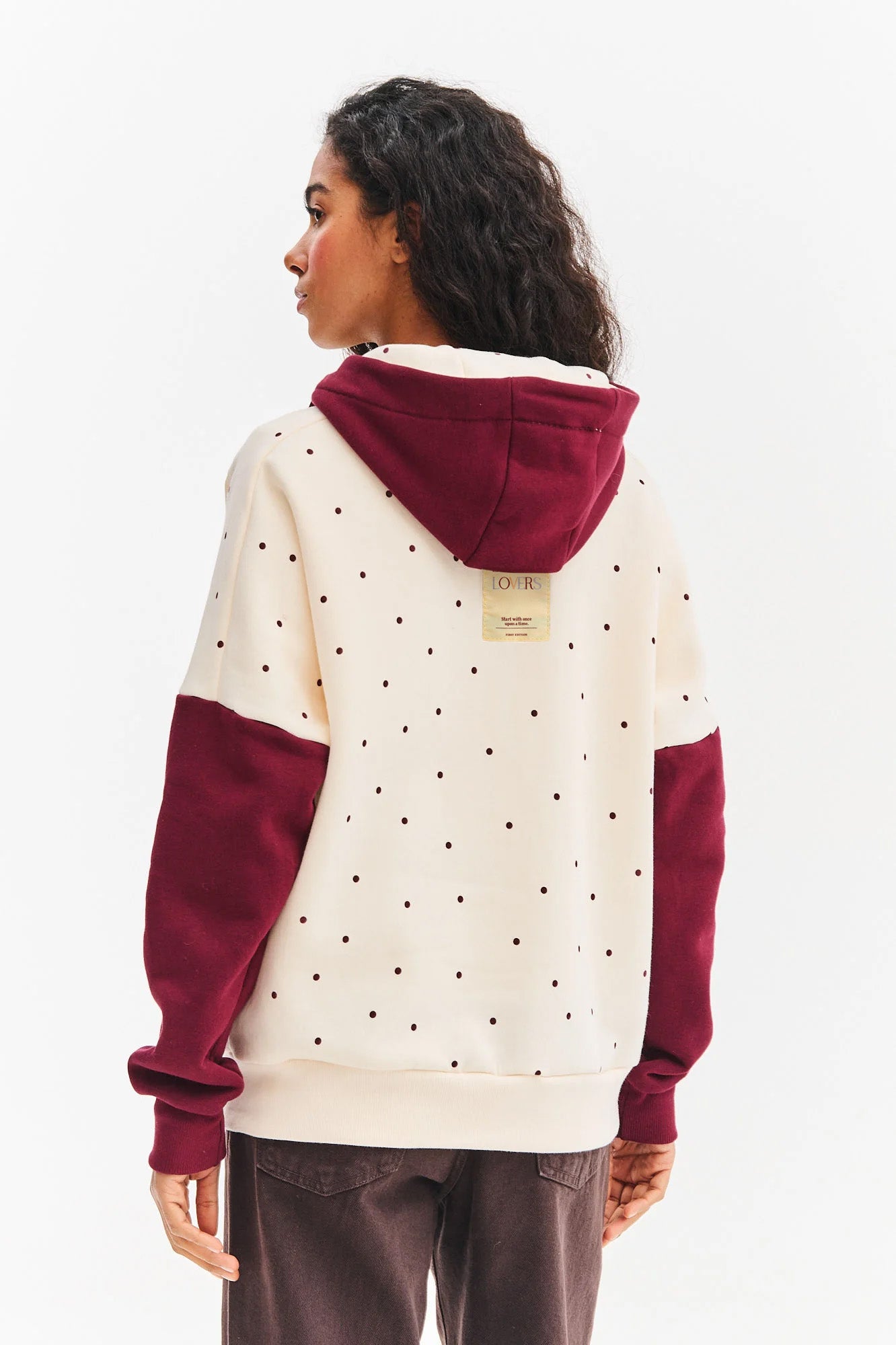 The Cozy Mind hoodie is the essence of comfort from the Book Club collection. Its design combines a cream shade with burgundy dots with contrasting sleeves and a wine-colored hood. The generous cut and large kangaroo pocket make it an ideal choice for chilly evenings.