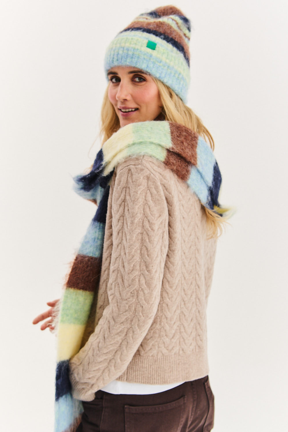 This cap is an ideal choice for those who appreciate original accessories. Soft as a cloud, the yarn wraps the head, giving plenty of warmth. Slightly elongated cut allows you to arrange it freely on the head. Create a set with the "Fall Fusion" scarf to impress with a cohesive, colorful look.