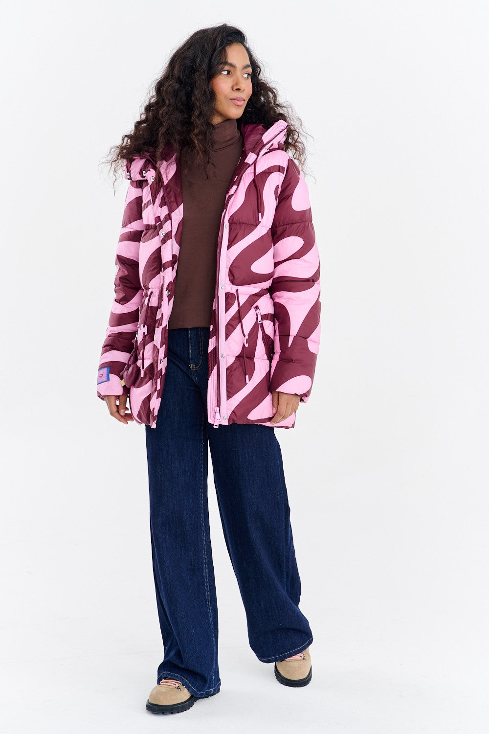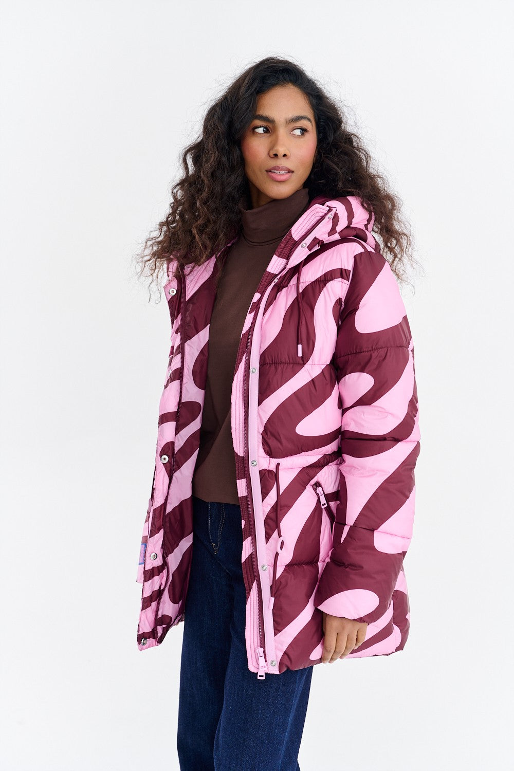 The Davos Wild Berry Winter Jacket is for bold women who love bold patterns. The same tried-and-true, fitted cut, this time in the "Wild Berry" version – an energetic combination of light pink and cranberry shades in an abstract pattern.