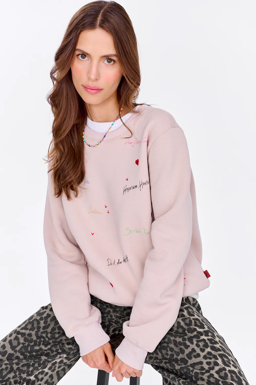 Let every day be a new page full of inspiration! Dear Diary sweatshirt is a cream-colored, oversized design that stands out with its unique, colorful embroidery featuring positive slogans. On the front of the sweatshirt, you'll find unique inscriptions such as "Scribble your heart out," "Unbottling good vibes," and "Dear Diary, count on me," which will remind you of the power of good emotions and small, everyday joys. Details such as hearts, hand-designed fonts, and subtle accents make this model a unique addition to any outfit.