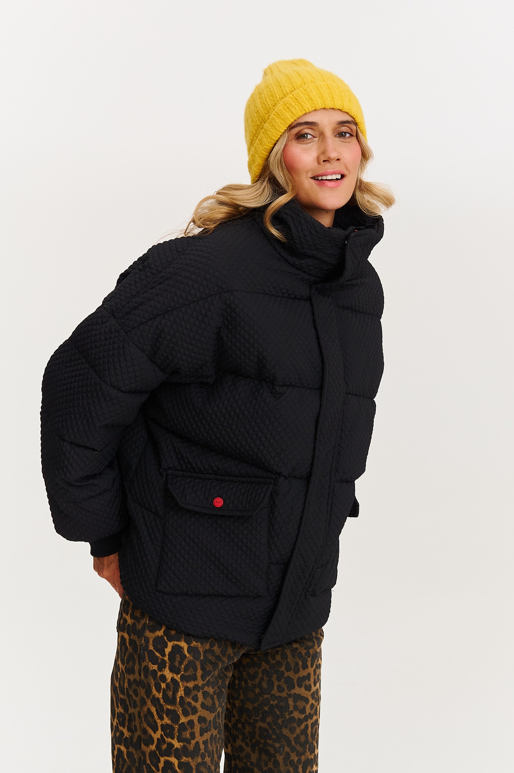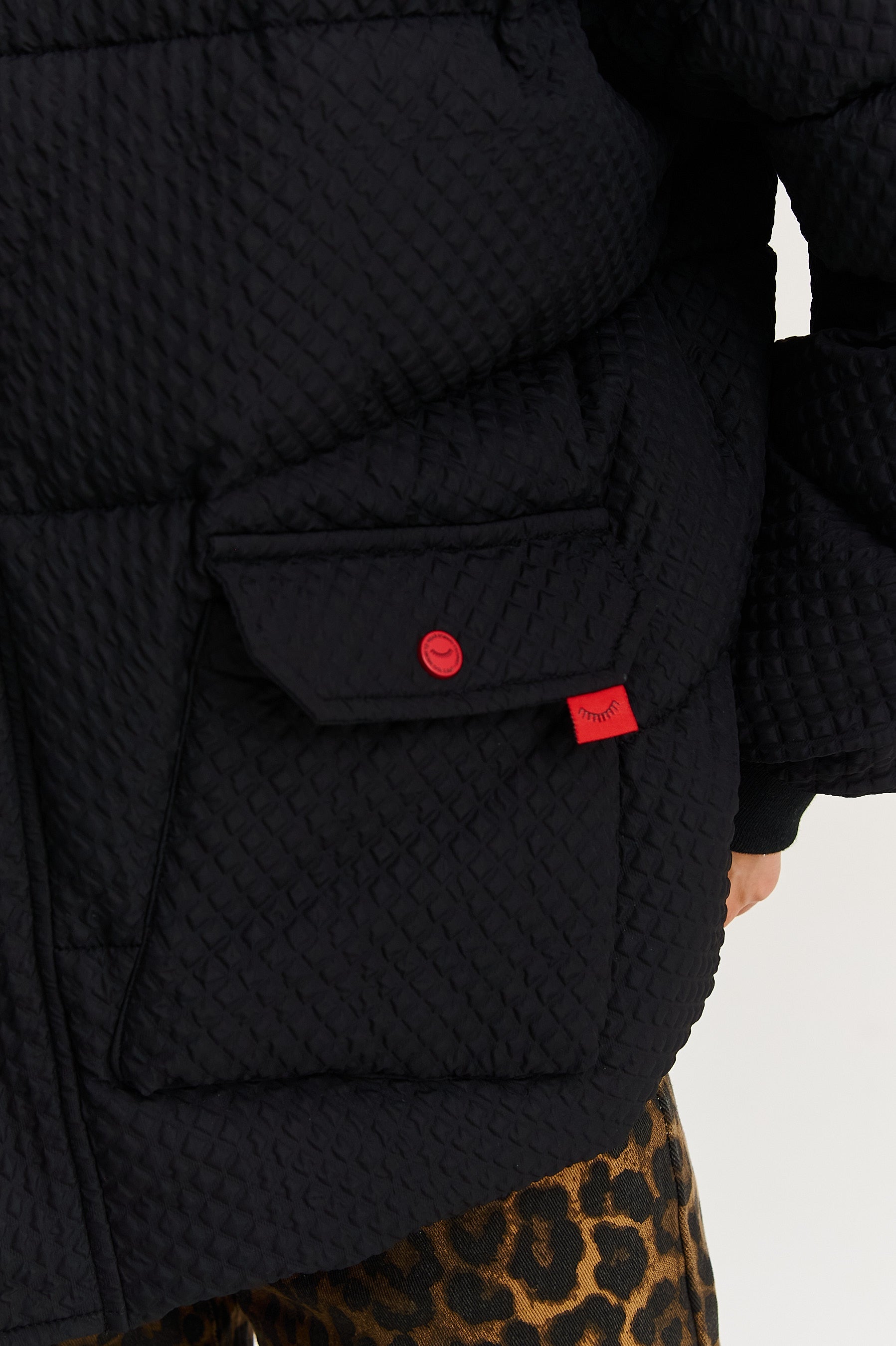 Denali Destiny Bites winter jacket is a classic bomber cut in a completely new version. The unique, embossed waffle-like texture of the fabric makes it stand out from other jackets. The apple-print inner lining and the slogan on the back are details that tell a story and add a fairy-tale charm.