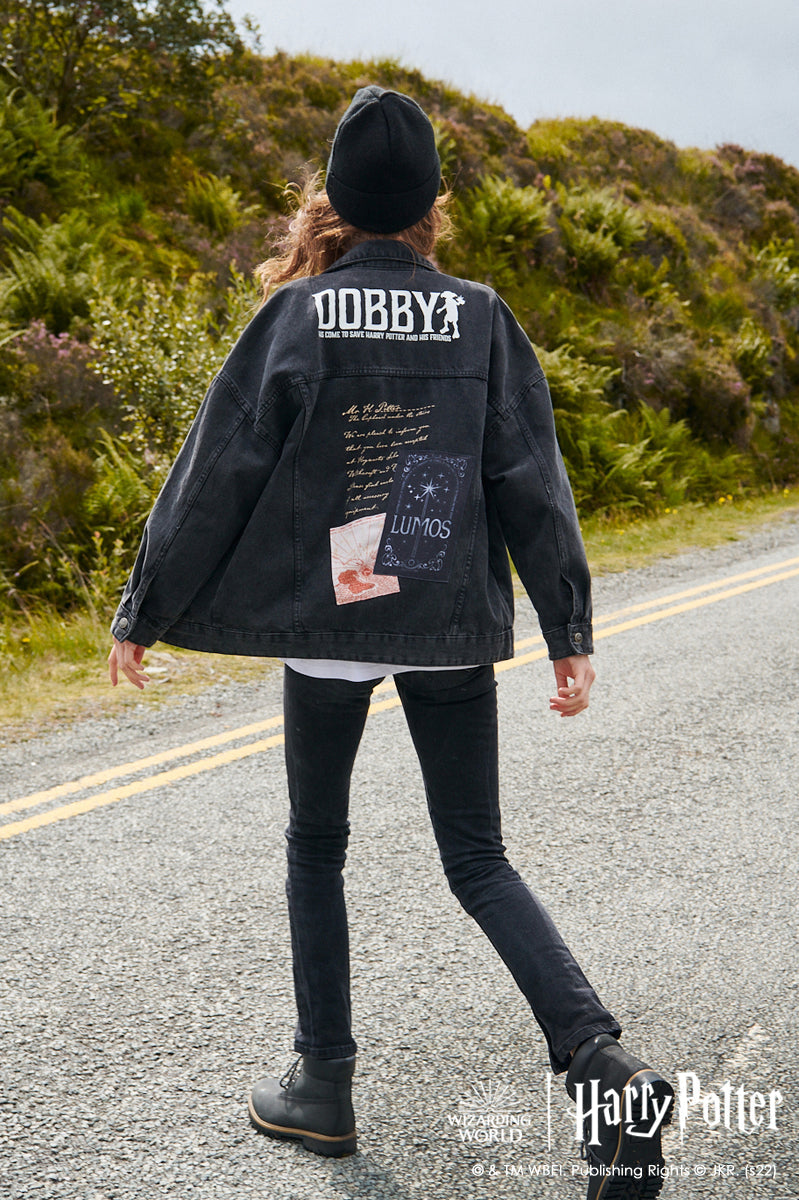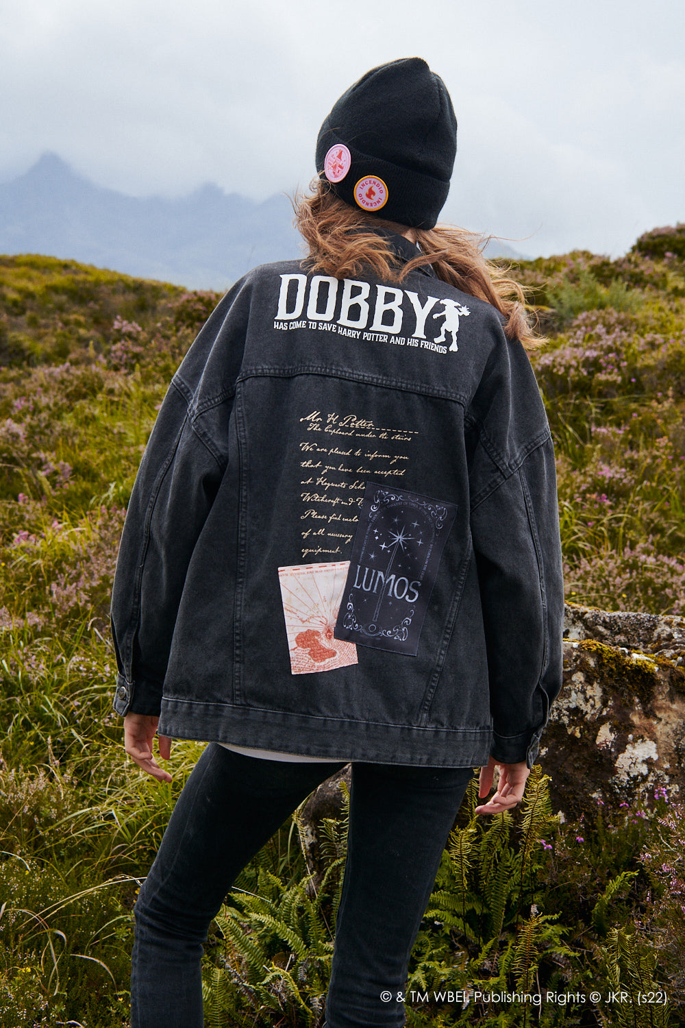 Dobby denim jacket - be feisty and characterful for autumn! In this Dobby denim transitional jacket, it's no hardship! It's full of interesting prints, motifs from the world of magic and with a nod to the helpful and crooked Dobby. This jacket is a must have for any fan of stories about young wizards!