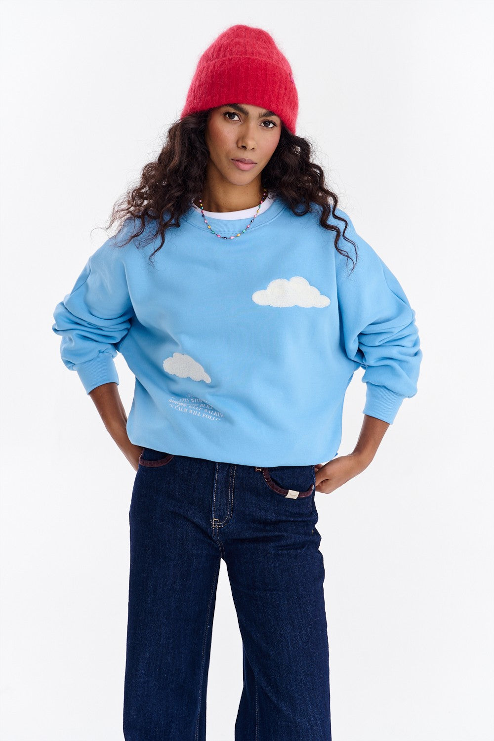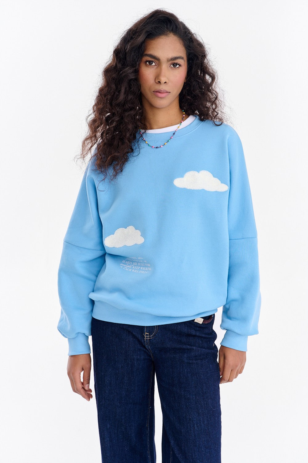 Unique details add to its charm: embroidered cloud-shaped appliqués. Wide cuffs on the sleeves and hem help keep the sweatshirt in place. Wear it with leggings, jeans, or sweatpants and feel that dreamy vibe.
