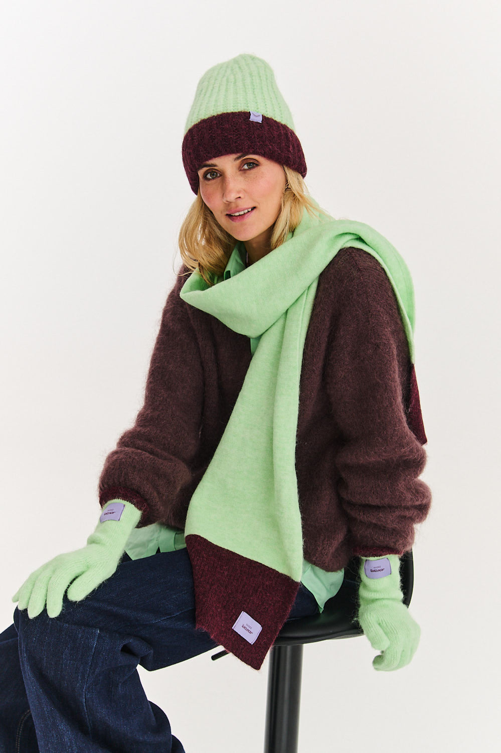 DuoPuff Frosty Lime gloves are a stylish and warm complement to your winter ensemble. This "Two Colors Gloves 3" model matches perfectly with a hat and scarf from the same line. The main part of the gloves is in a shade of fresh lime, and the turn-up cuff is a deep brown color.