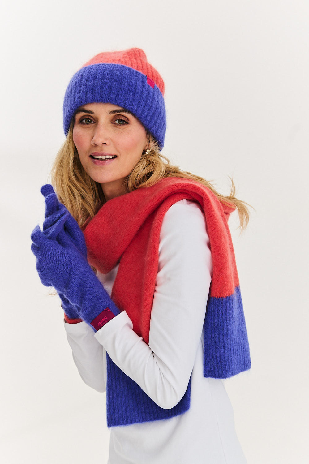 The DuoPuff Ruby Midnight two-tone scarf is the perfect choice for fans of striking contrasts. The larger part of the scarf has an energetic orange-red color, which perfectly matches the ribbed trim in deep navy blue.