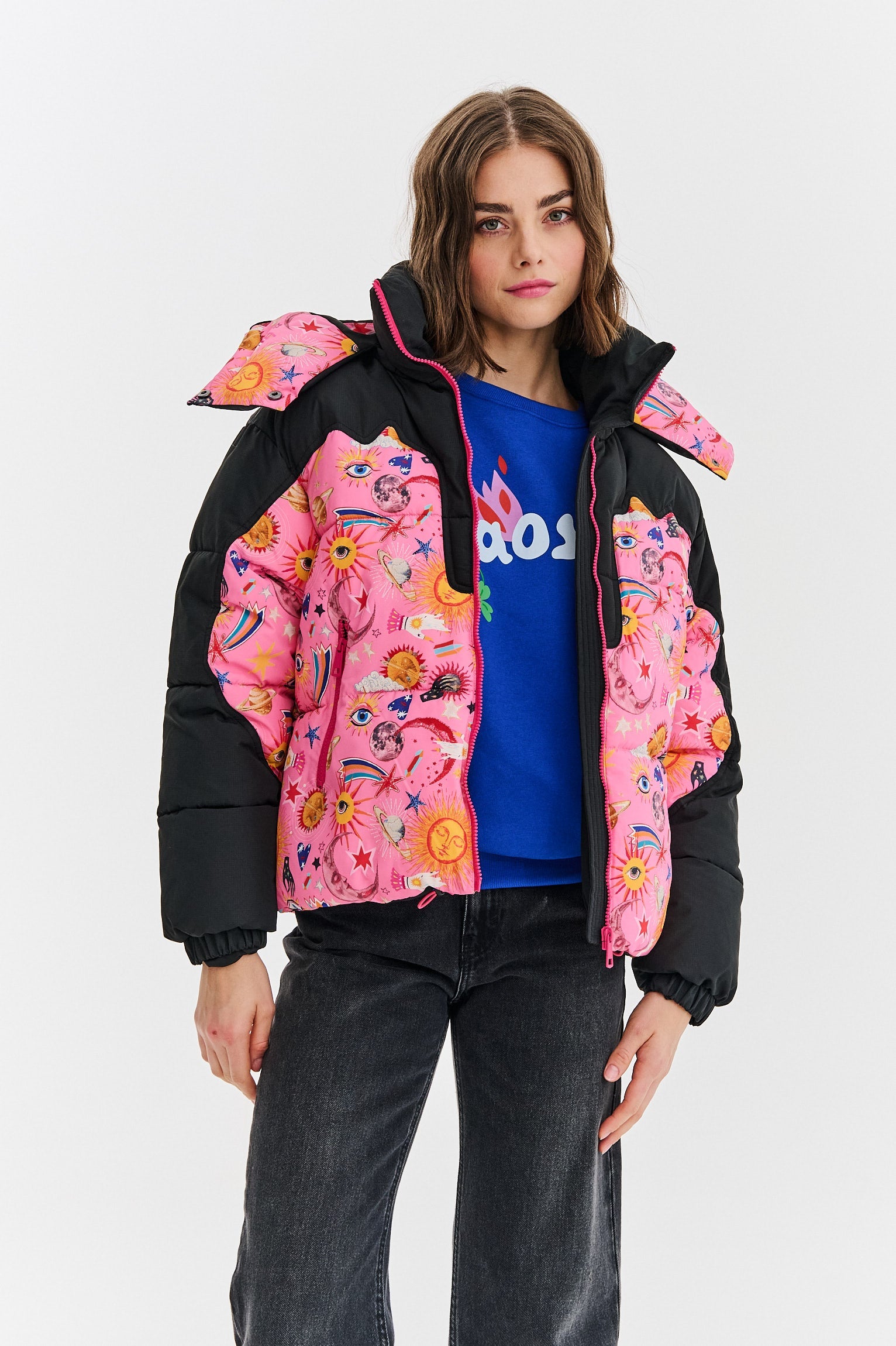 Ember Astro Vibes winter jacket is a proposition for dreamers and women with a sense of humor. Suns, planets, stars, and eyes create a magical, surreal print that will not leave anyone indifferent. The contrasting black sleeves and hood give the jacket a modern, sporty character.