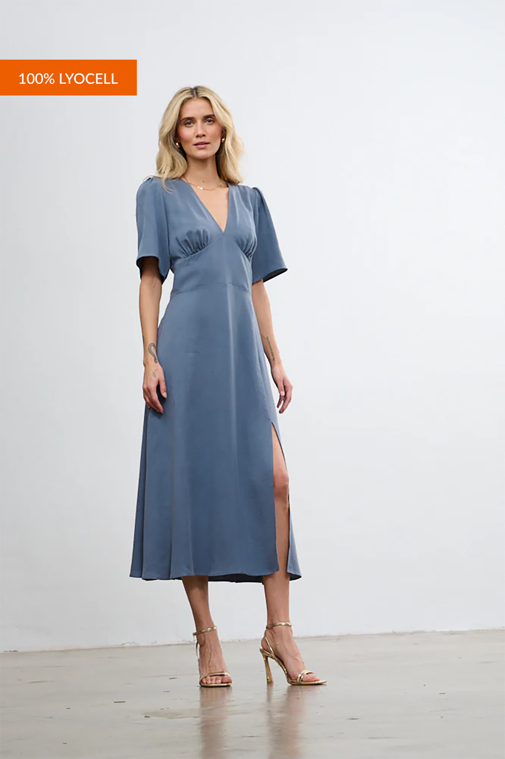 Eternal Shadow midi dress proves that smooth fabric doesn't have to be boring. Made of 100% lyocell, it delights with its softness and the way it drapes. Gathering under the bust ensures a perfect fit, and the deep V-neckline adds character.