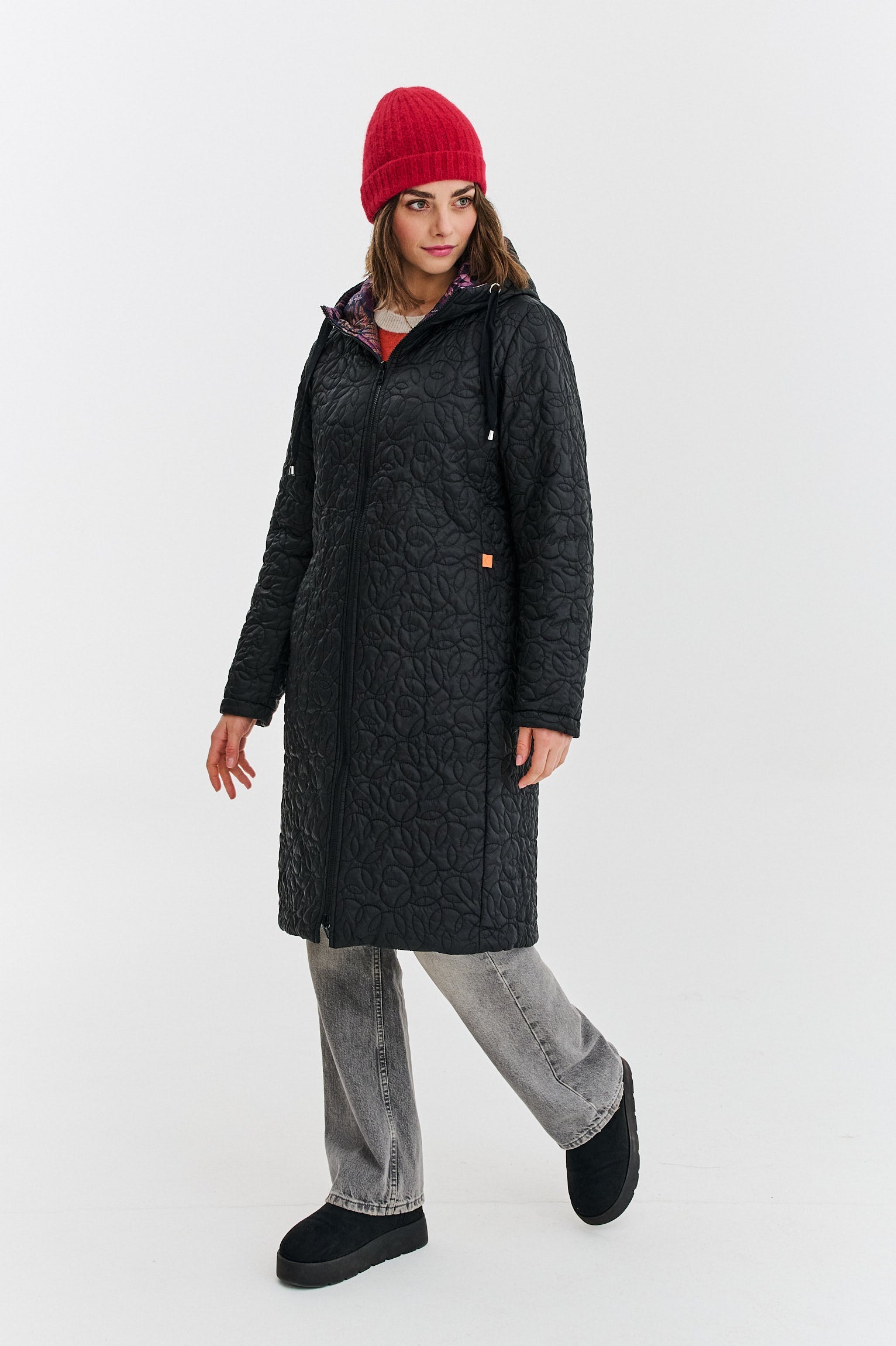 Fern Flower reversible quilted coat is a proposition for romantics and minimalists all in one. The long, straight cut with a hood provides warmth and comfort, while the ability to switch sides makes it an extremely practical wardrobe item. The patterned side will liven up any outfit, while the black side will add class and versatility.