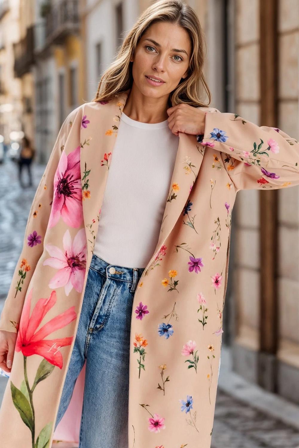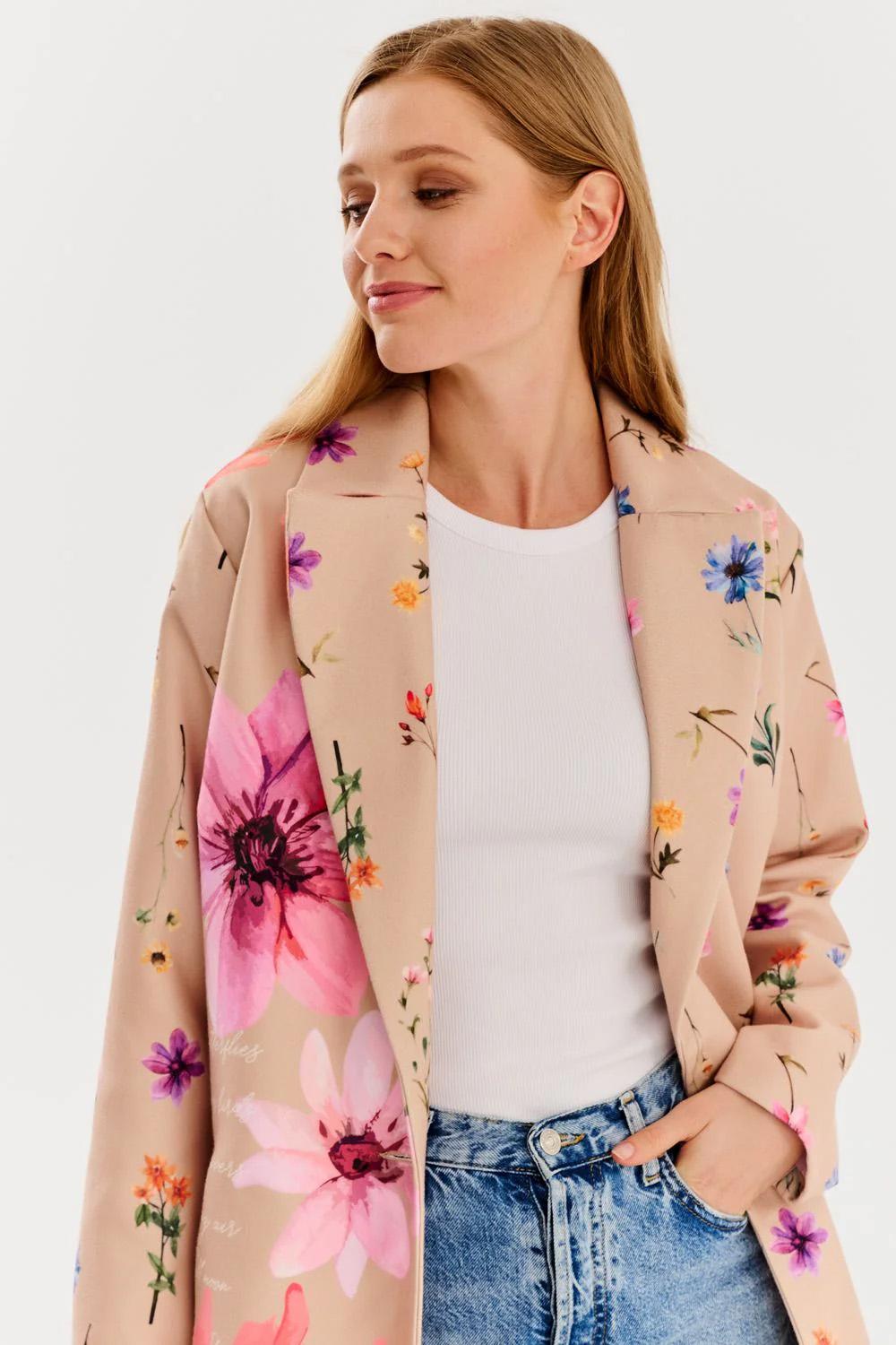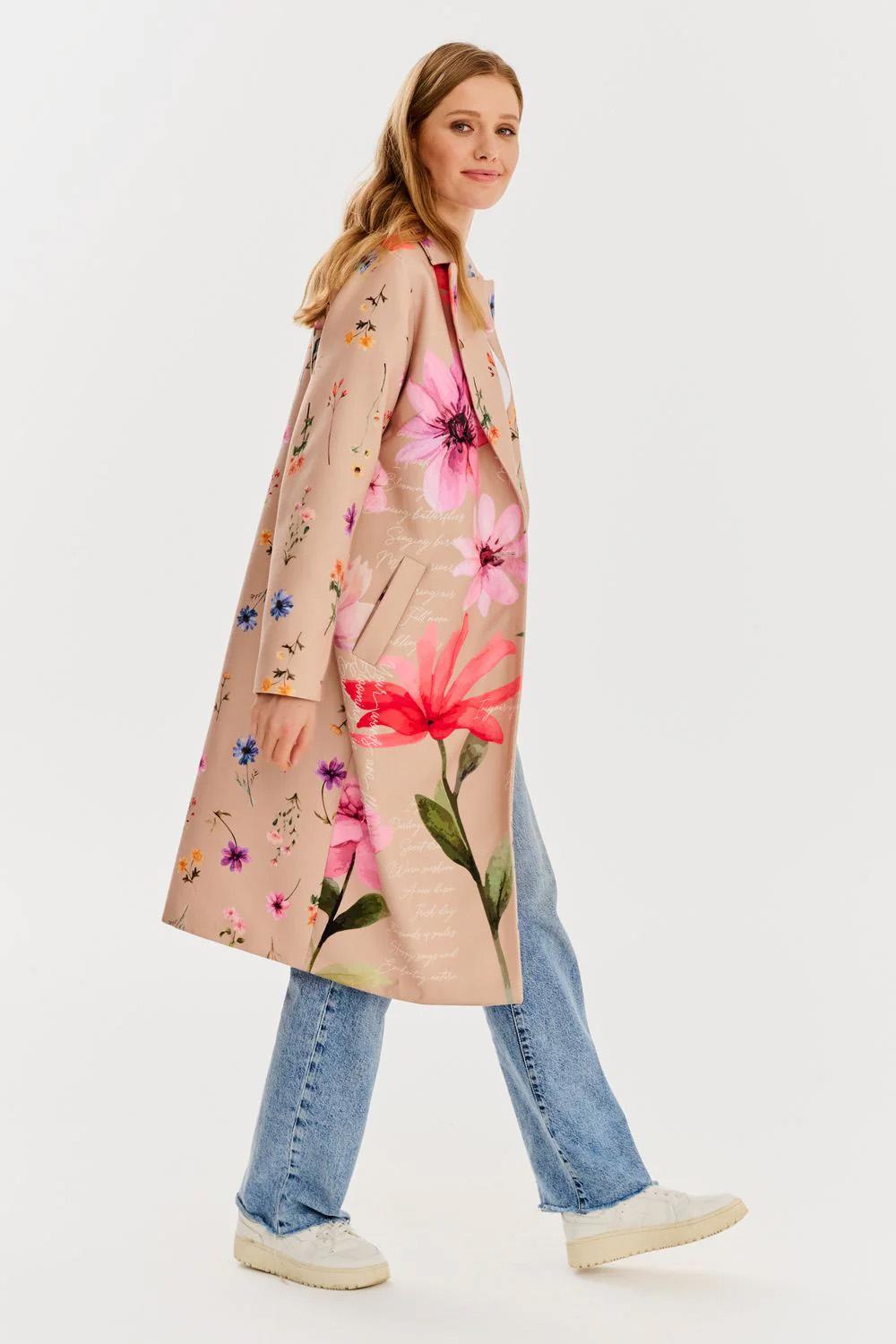 Surrounded by gray coat suggestions, the classic Floral Bloom coat becomes an oasis of distinctive style and individuality. Jego powierzchnia została ozdobiona kwiatowymi nadrukami, które zostały umieszczone na beżowej tkaninie. The flowers give the coat a romantic touch, and at the same time make it an eye-catcher despite its classic color.