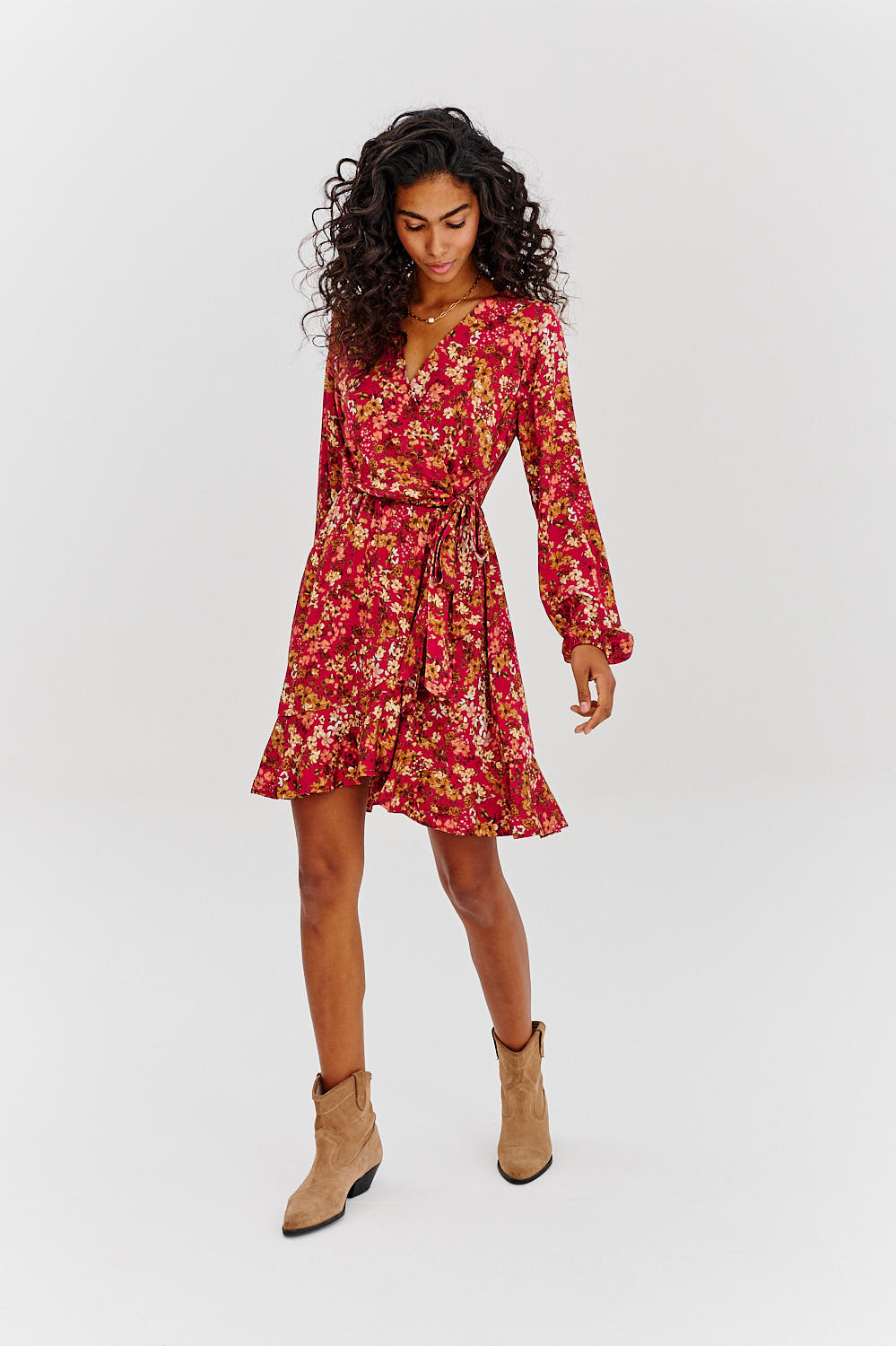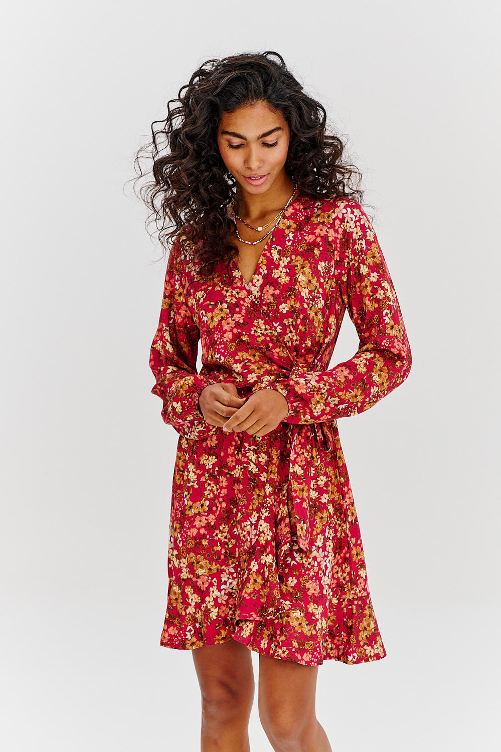 Romantic, airy and full of feminine charm - Golden Bloom mini dress is a proposal that emphasizes subtlety and natural grace. The envelope cut with binding at the waist beautifully shapes the silhouette, and the ruffle at the bottom adds lightness and delicate movement. The floral-inspired pattern makes it the perfect choice for the transitional season - both for everyday wear and special occasions.