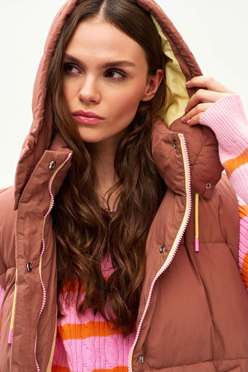 The Golden Hour quilted vest is the perfect choice for fans of earth tones and textures. It is eye-catching and provides thermal comfort. Yellow details inside the hood add a modern, energetic touch.