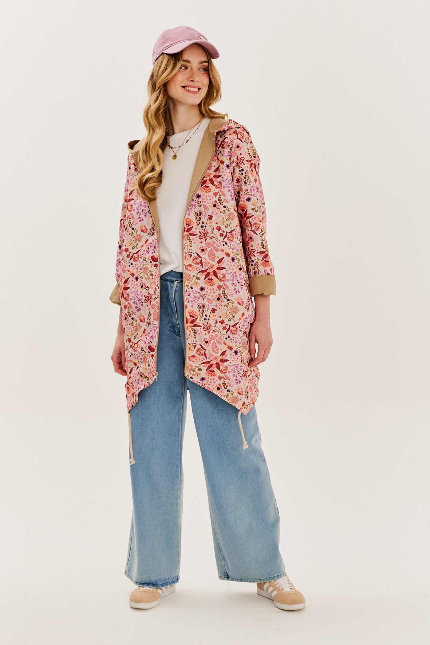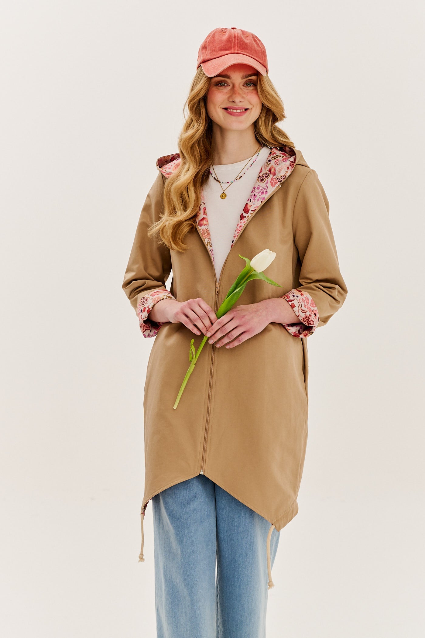Golden Meadow double-sided jacket is a combination of comfort and style. Its unique design combines the timeless beige color with an energetic floral pattern, creating a unique effect. Oversized cut gives it a fashionable casual character, while the hood and functional pockets emphasize its unique style.