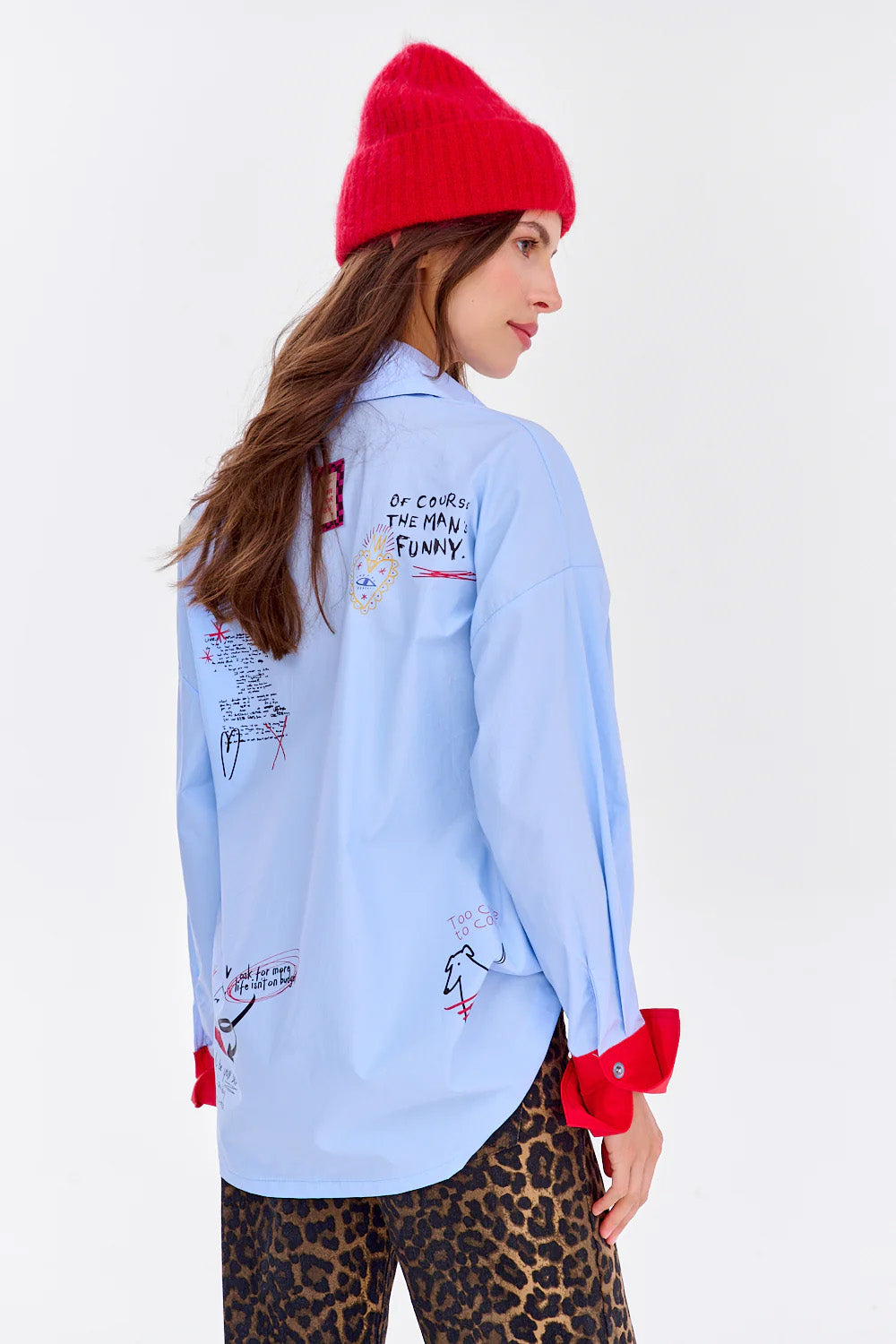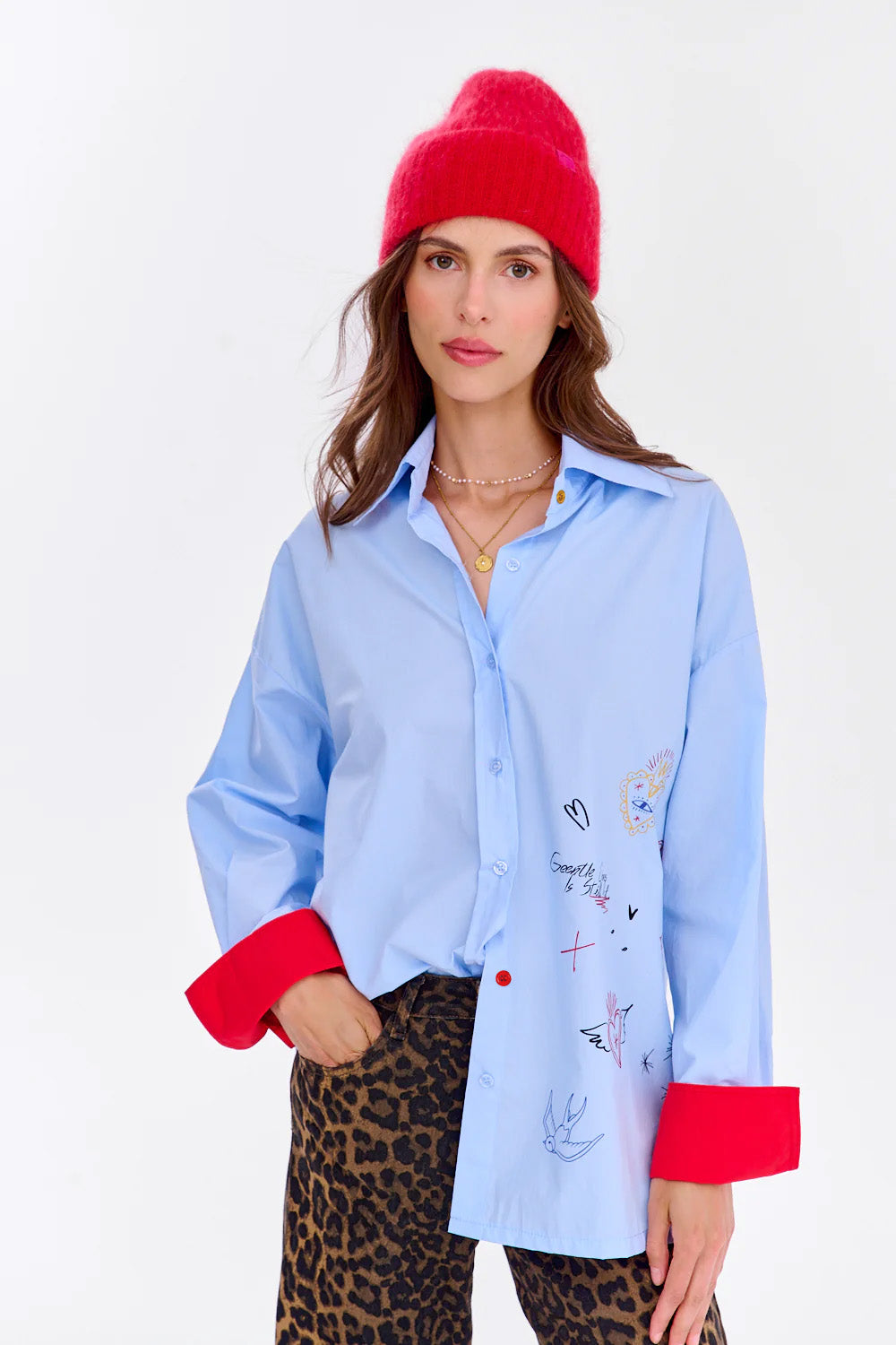 The loose fit makes the shirt fit perfectly and ensures comfort. Original illustrations and slogans referring to positive emotions add an artistic, unique character. The distinctive red cuffs and contrasting buttons break the classic form and make it even more unique.