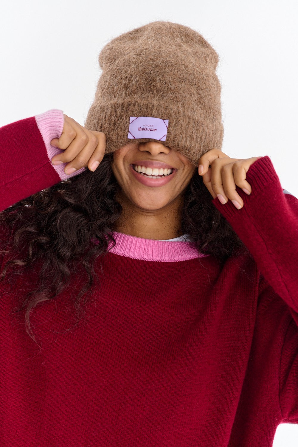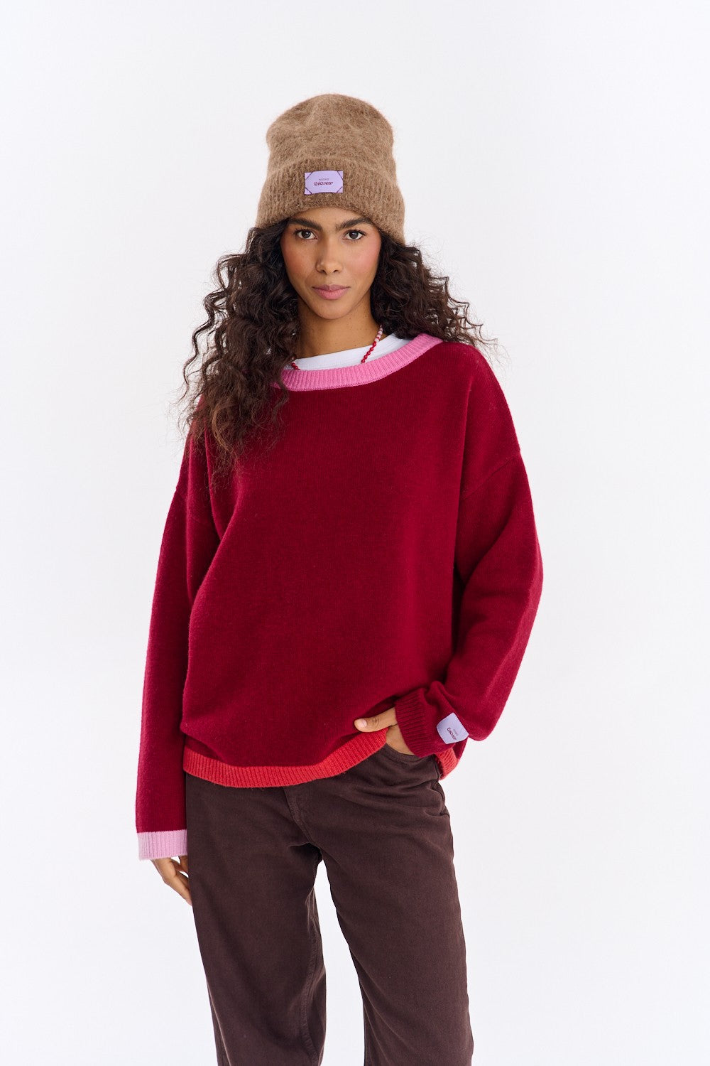 The Good Vibrations wool sweater is the essence of the autumn color palette. The sweater's deep burgundy color beautifully complements the pink piping at the neckline and the lighter coral trim on the sleeves and hem. It's a simple way to add a pop of color to muted autumn outfits.