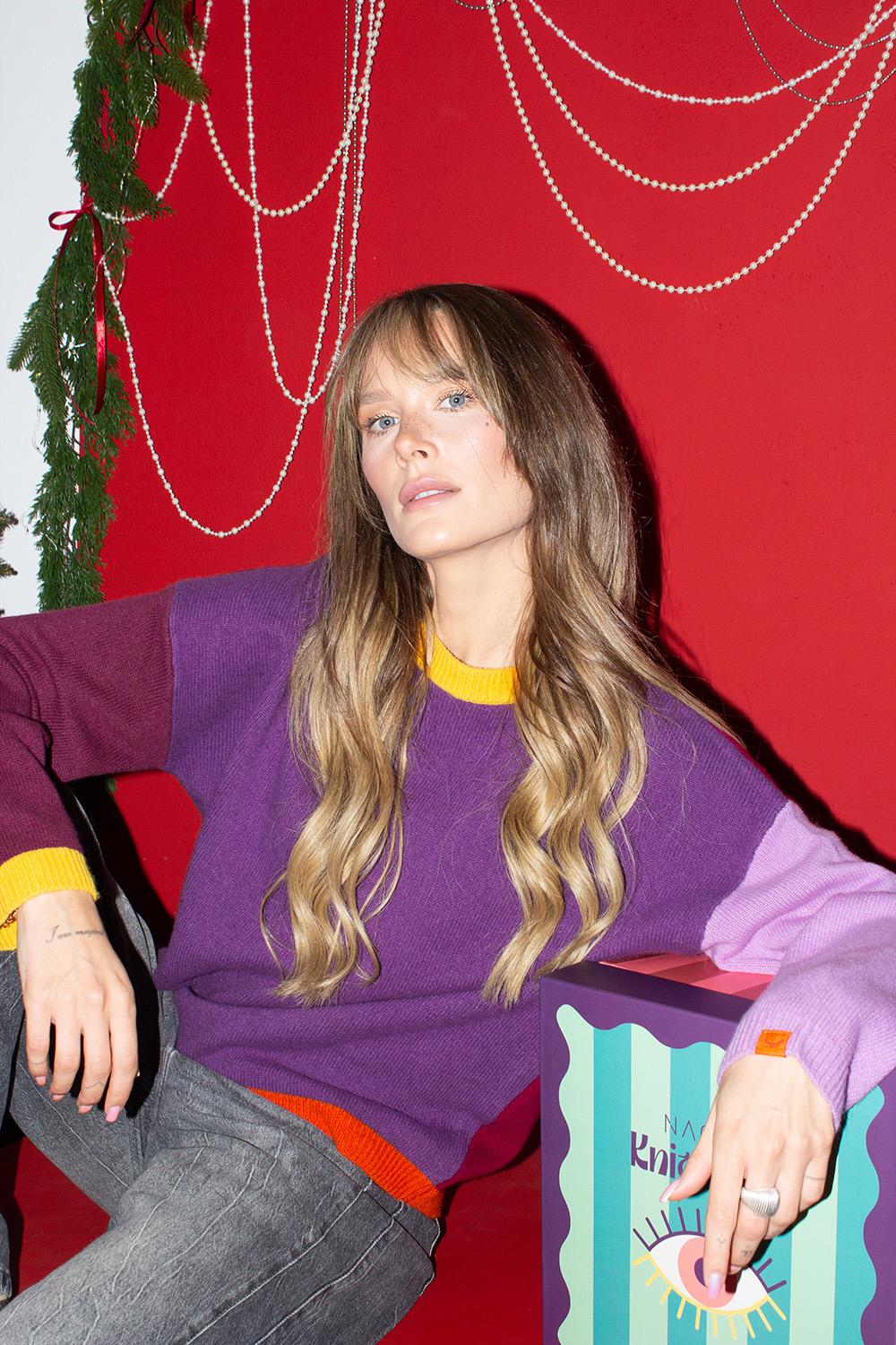 Happy Go Lucky wool sweater is a real treat for fans of the color-block style. Designed to catch the eye, it combines three shades of purple – from light lavender on one sleeve, through medium purple on the front, to deep burgundy on the back and other sleeve.