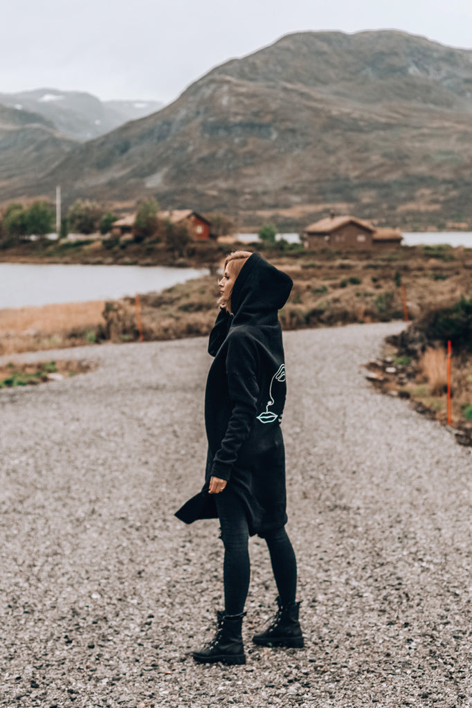 Its extended cut provides warmth and comfort, allowing you to wear it as a sports dress or paired with slim trousers. The deep black and contrasting print create a modern yet poetic whole. The generous hood and soft fabric will make you never want to take it off. It's the perfect choice for dreamers.