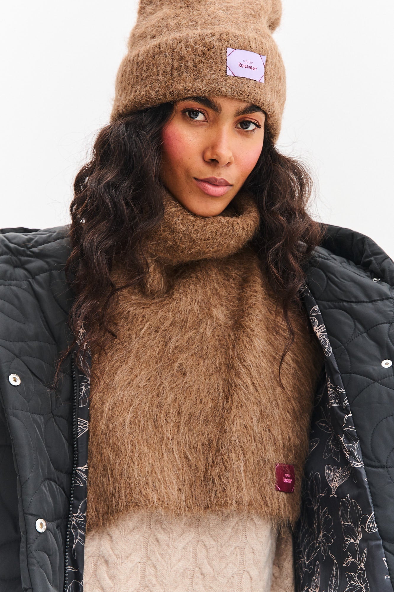 Huggy Mocha scarf is a modern take on winter accessories. Its unique turtleneck-like shape perfectly protects the neck from the cold without creating unnecessary bulk under a coat or jacket. It is the ideal solution for those who value minimalism and functionality.