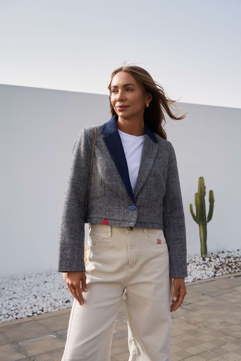 The Unwritten Jacket with a Detachable Bottom is a fashion chameleon. The classic herringbone top can be transformed in a second into a short, elegant jacket or a longer version with a raw denim finish.